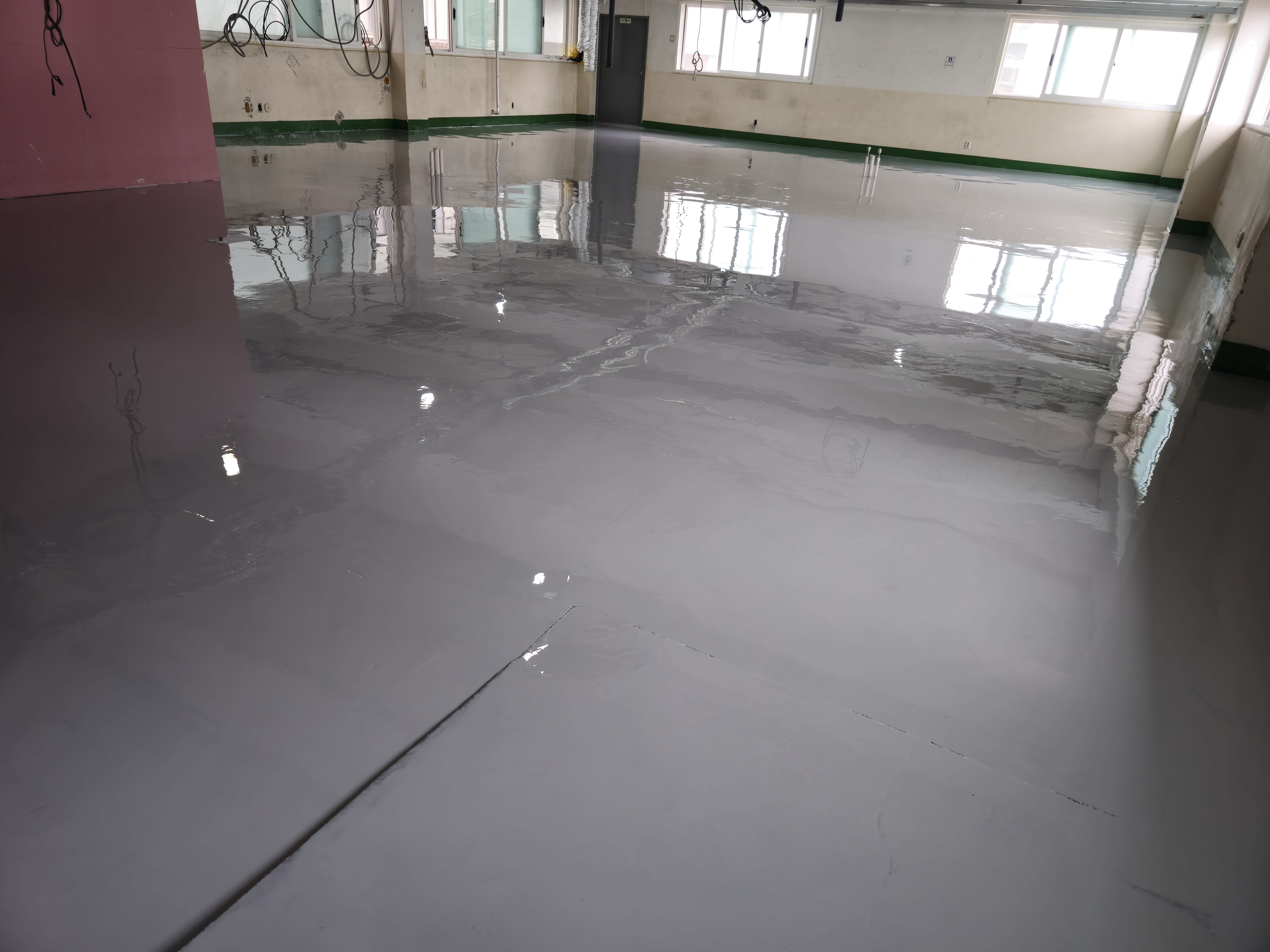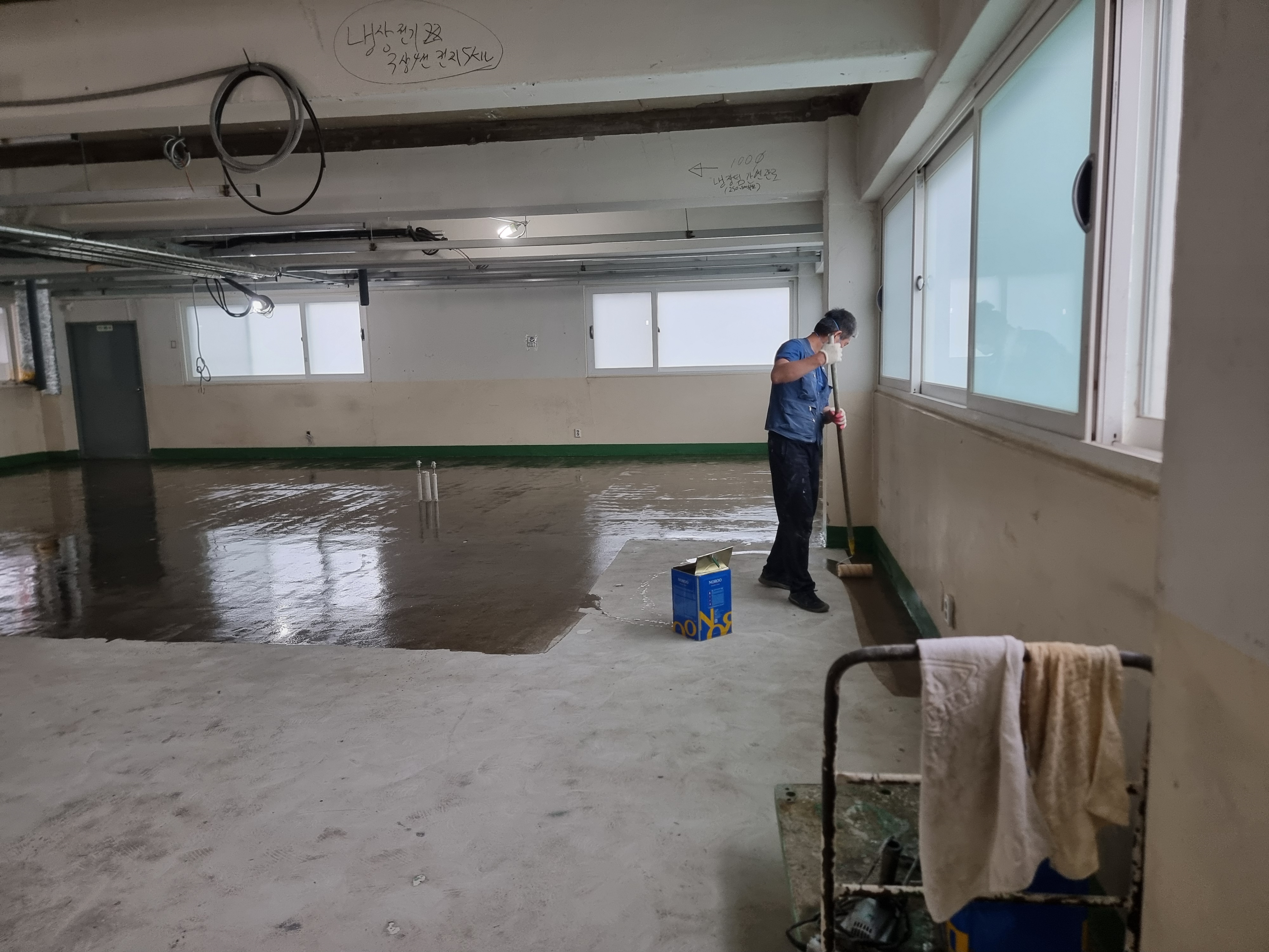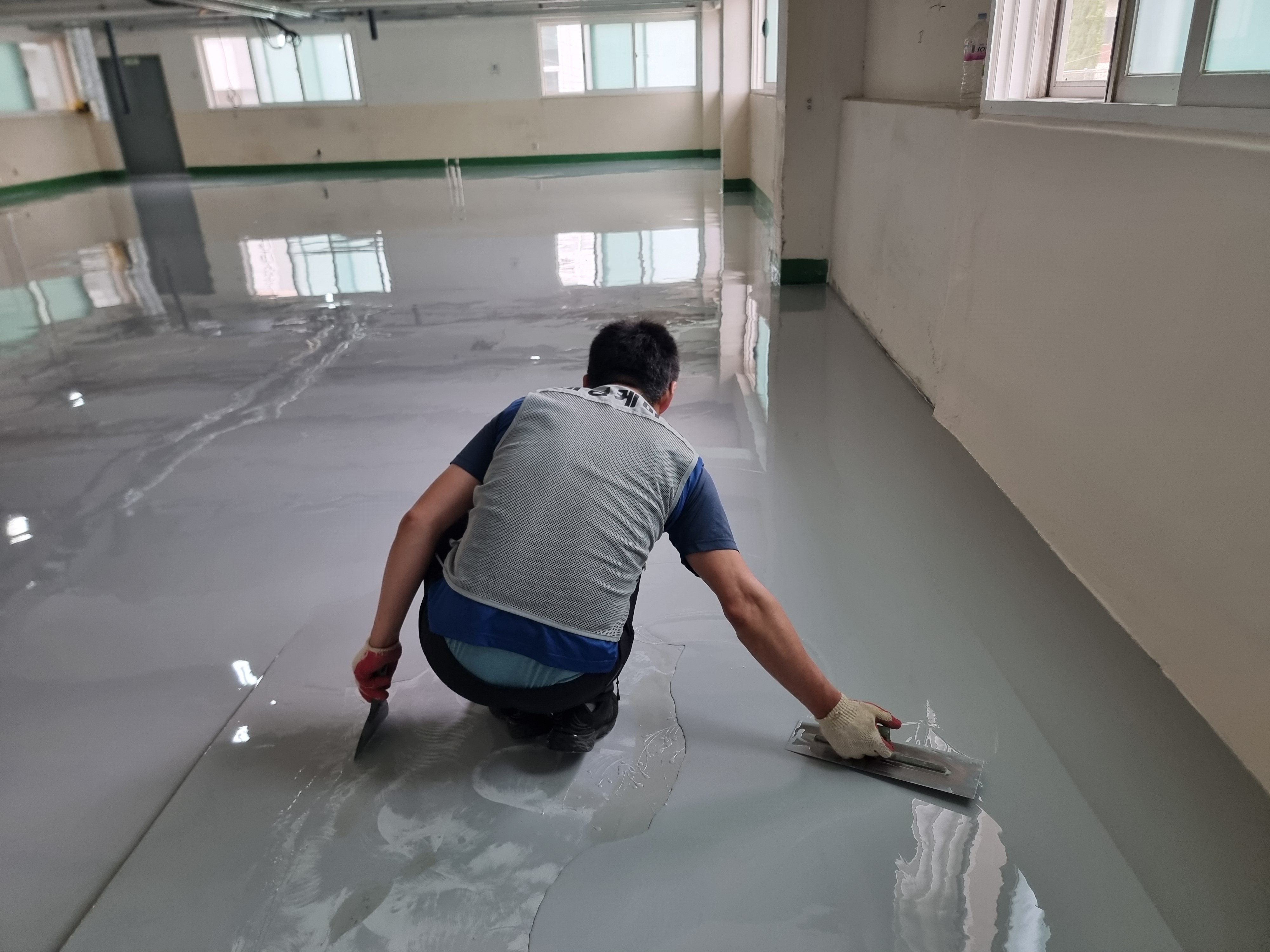 중도면터리, 퍼티 보강후 에폭시라이닝 2미리 상도를 도포합니다. 2액형 에폭시 라이닝재를 전동믹서기를 이용하여 2~3분간 믹싱한후 바닥에 고루 부은 다음 레기나 고대를 이용하여 도포합니다. 단차나 이물질이 전여 없는 평활도 있는 바닥재를 만들수 있습니다.