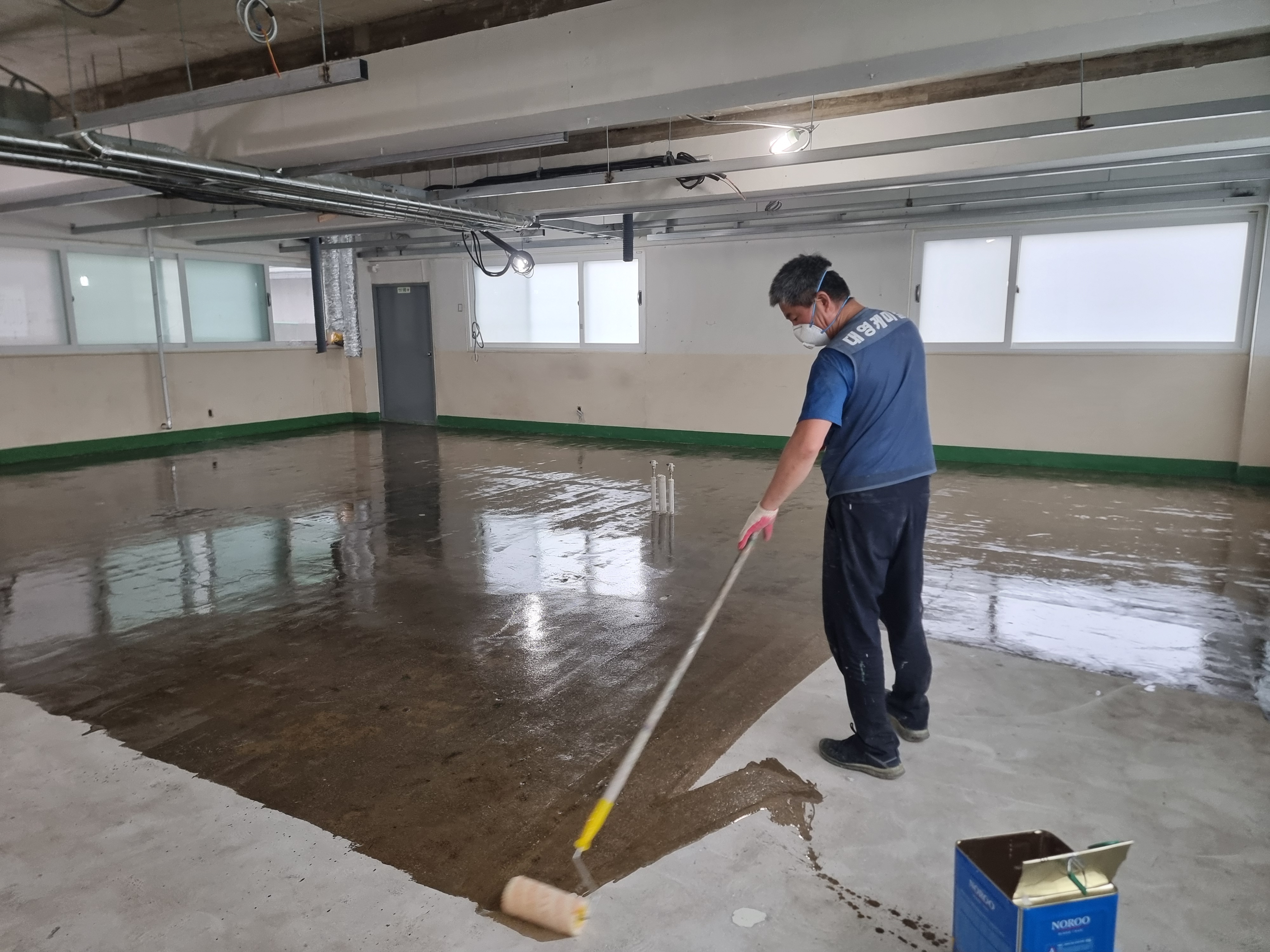 바닥 콘크리트 프라이머 도장시 롤러나 붓등을 사용하며 에어리스나 스프레이 도장은 콘크리트 기공과 표면의 마찰 접착률이 떨어지므로 사용해선 안됩니다. 콘크리트 소지가 다공질일 경우나 강도가 약할경우 에폭시 침투성 프라이머를 시공해 주어야 하며 2회정도 시공해 줍니다.