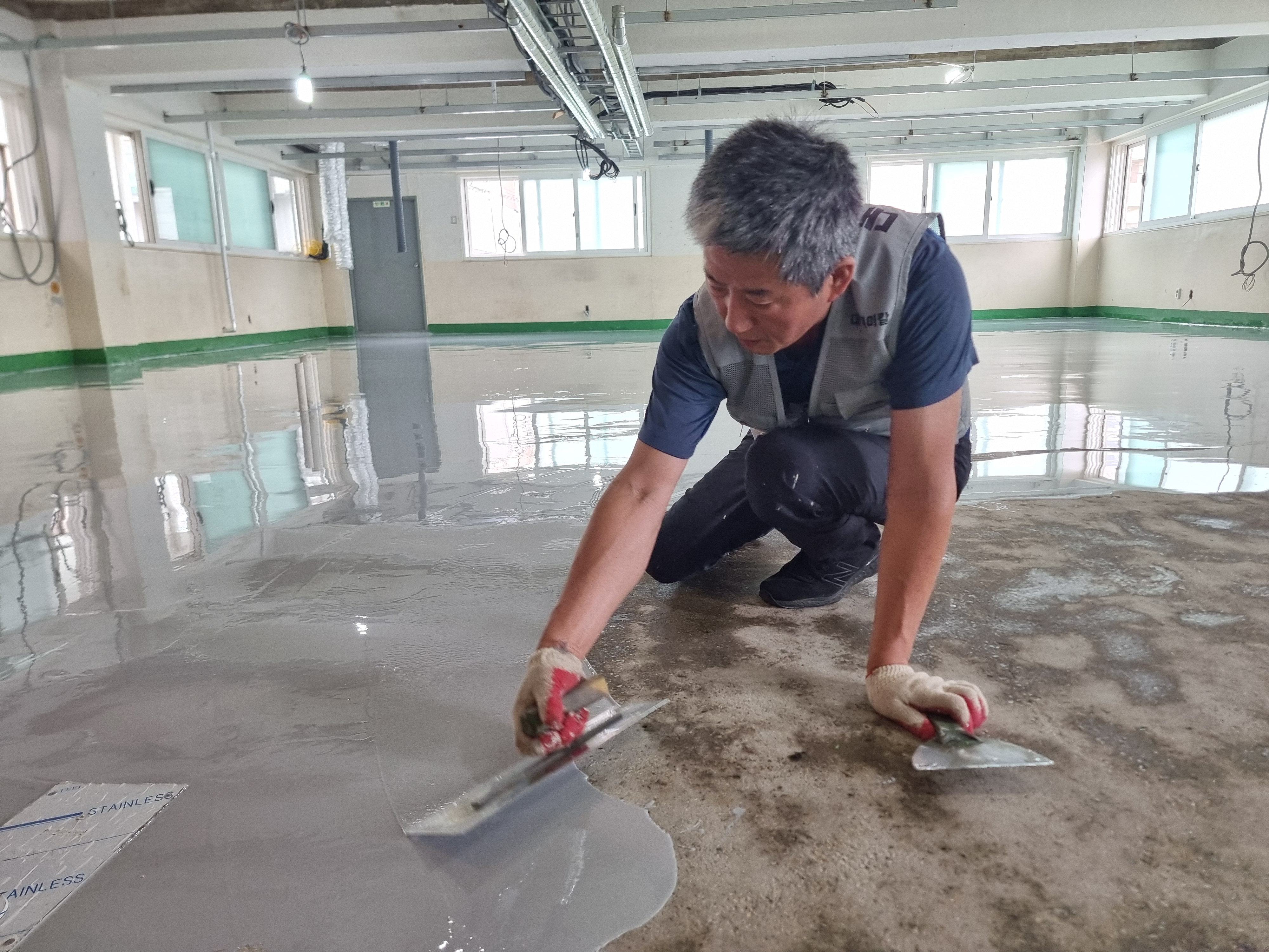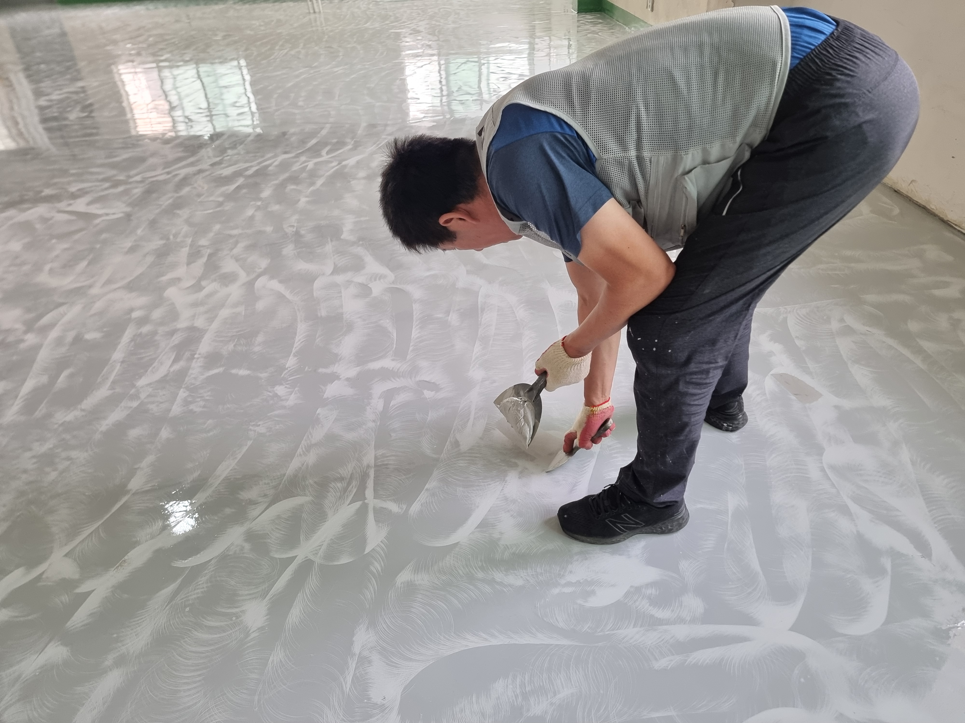 중도 면처리후 표면의 단차나, 핀홀, 미새크랙은 에폭시퍼티로 2차 매꿈 시공해 줍니다. 상도재 시공전 표면의 오염물질은 최대한 없애야 하며 깨끗한 표면을 얻기 위하여 꼼꼼히 바닥을 살피고 보강해 줍니다.