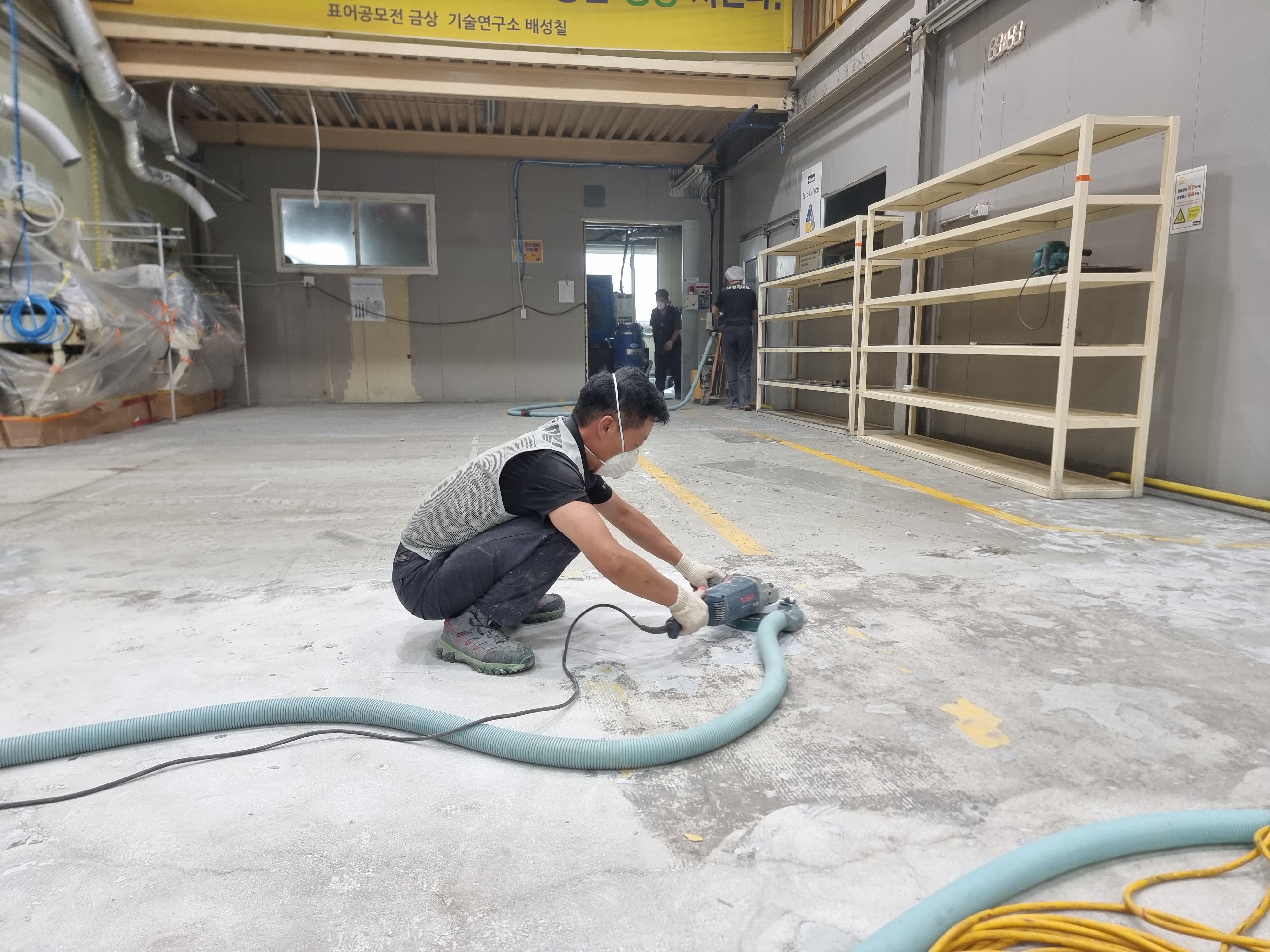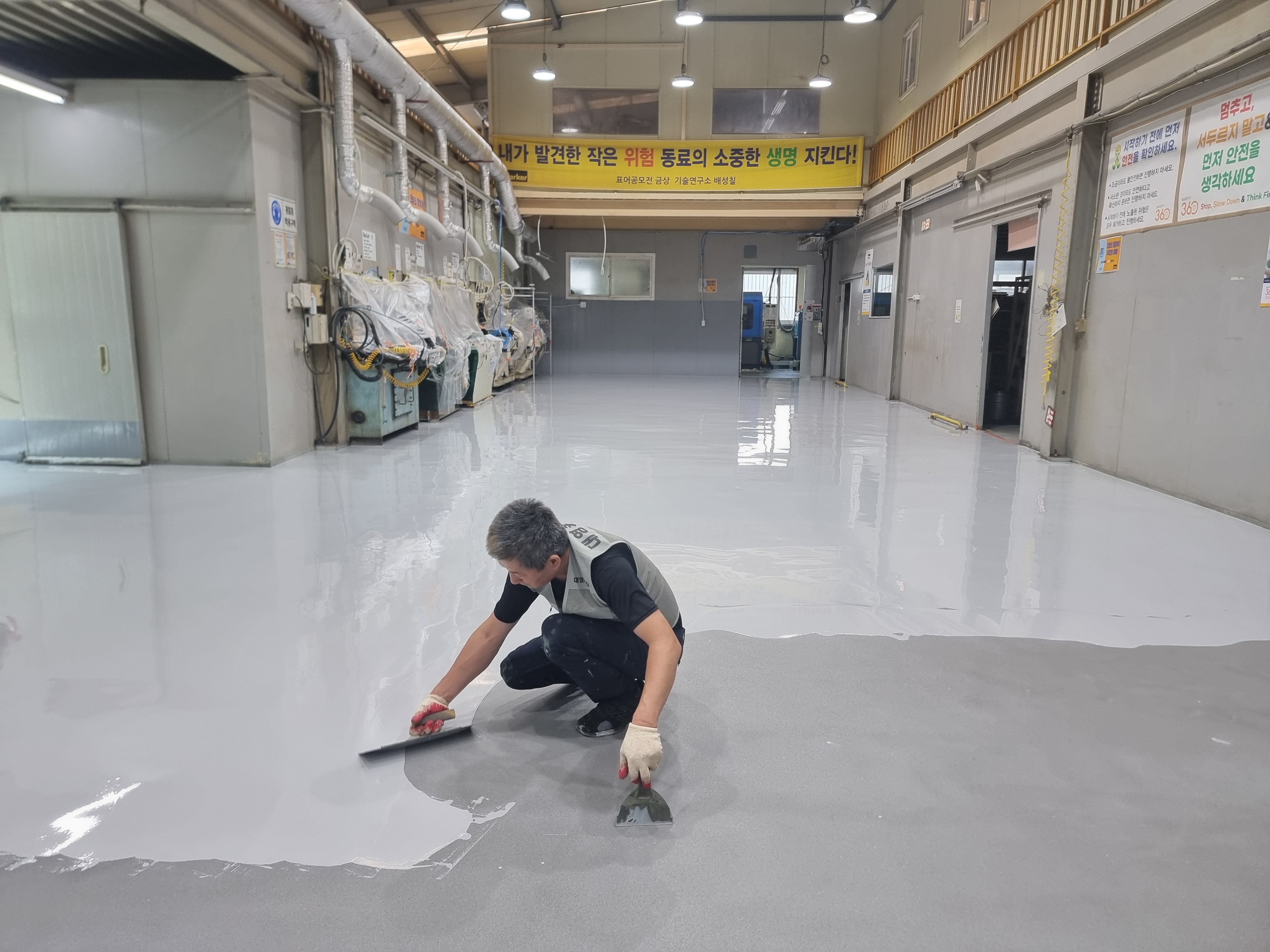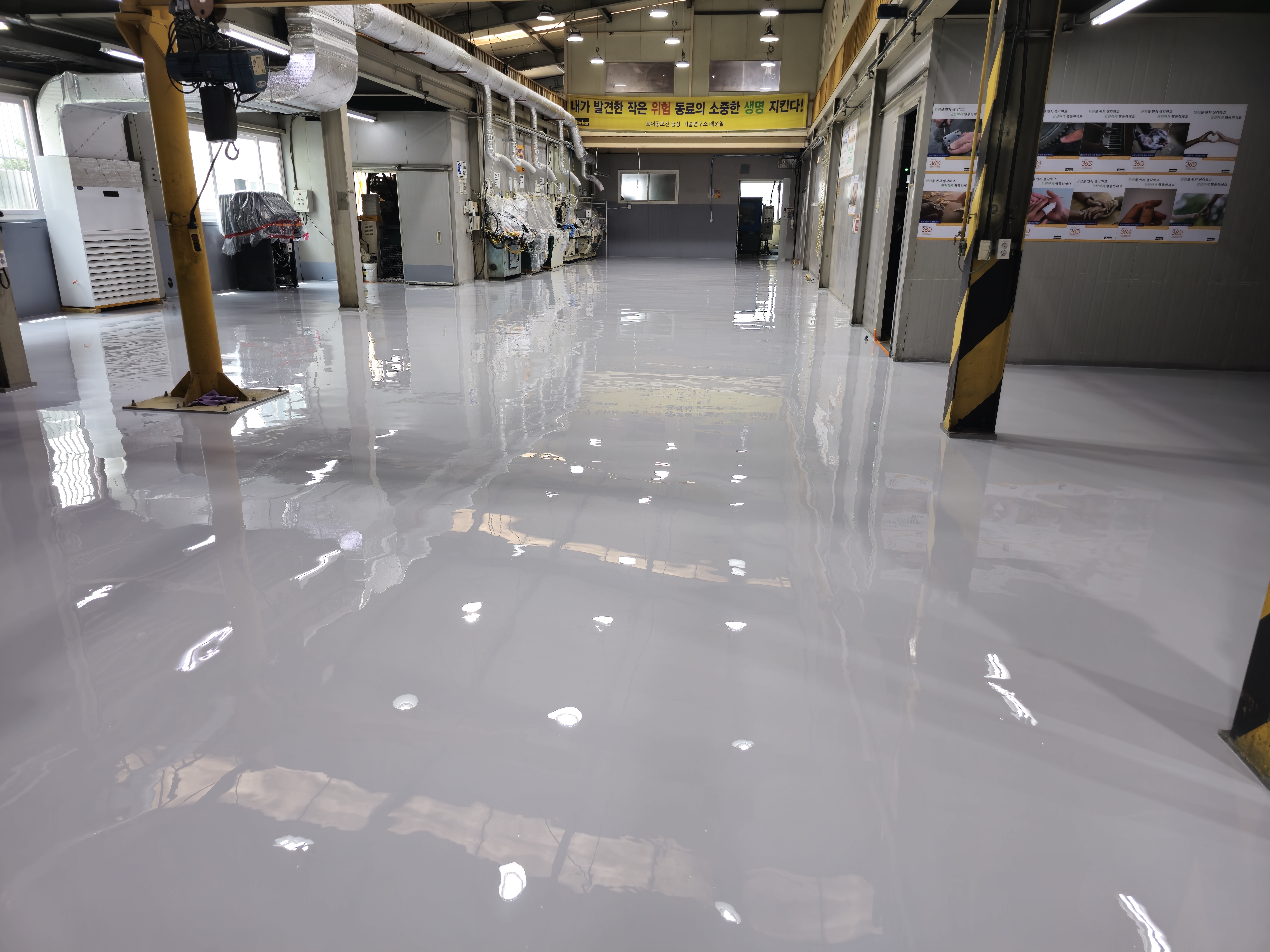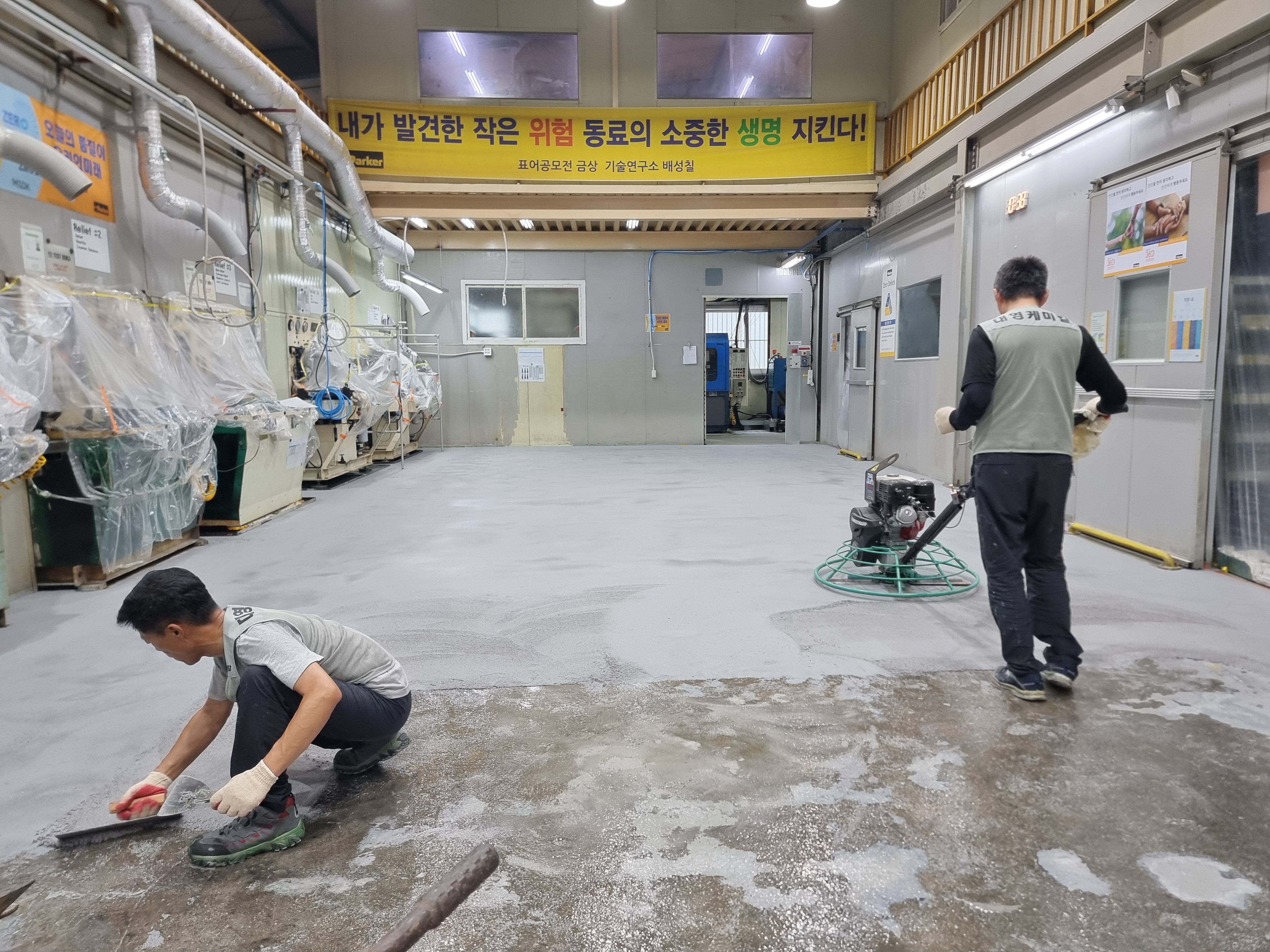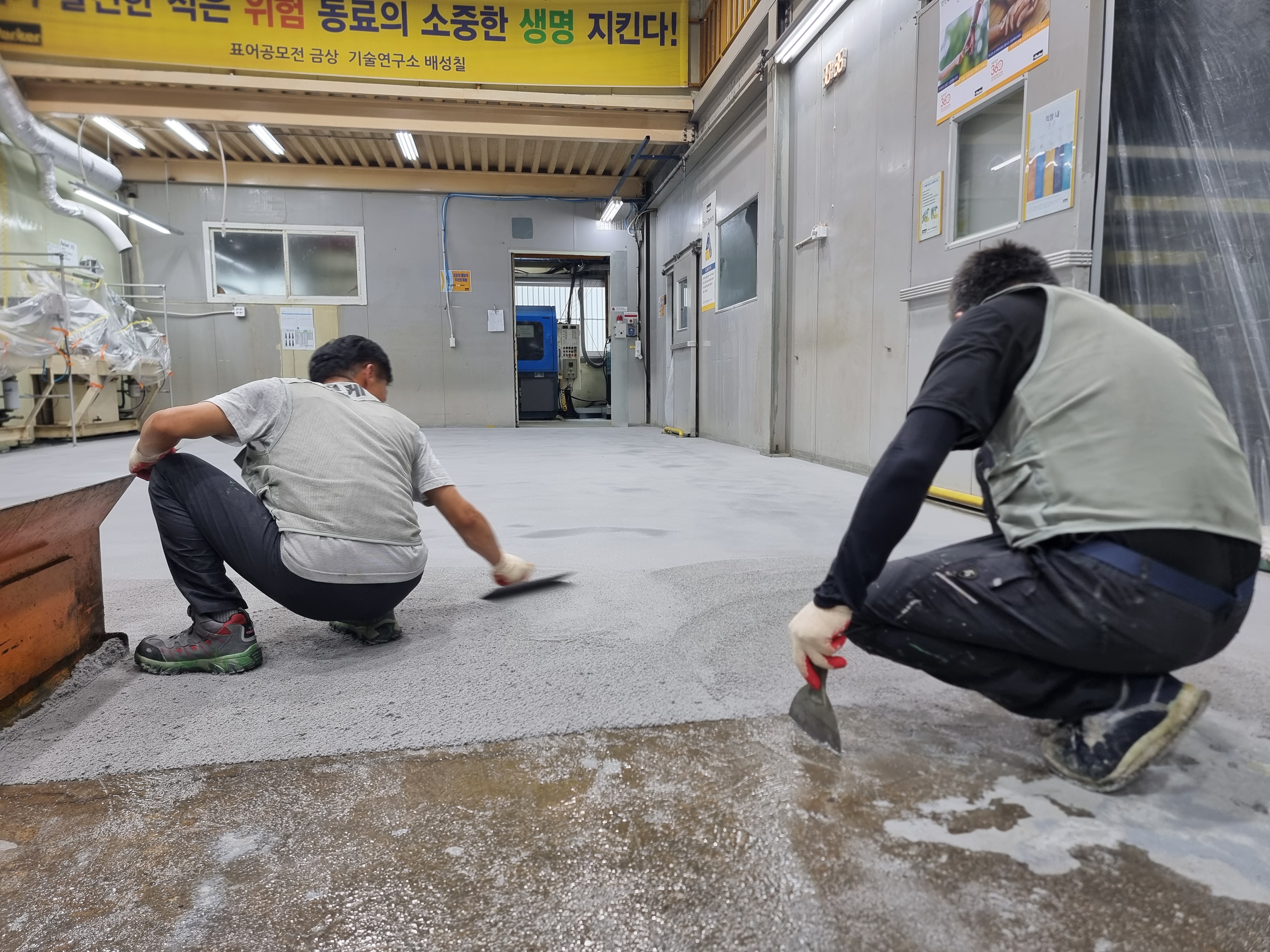 파카한일유압 AUX TEST LINE 에 2차 레진몰탈, 에폭시 작업을 합니다. 기존의 바닥재가 손상이 심하고 기름성분이 30년동안 침수되어 있습니다. 손상된 에폭시를 100% 제거하고 기름을 닦고 중화시킵니다. 접착강도와 내구성을 위하여 레진몰탈을 미장하고 에폭시라이닝을 추가 도포 합니다.
