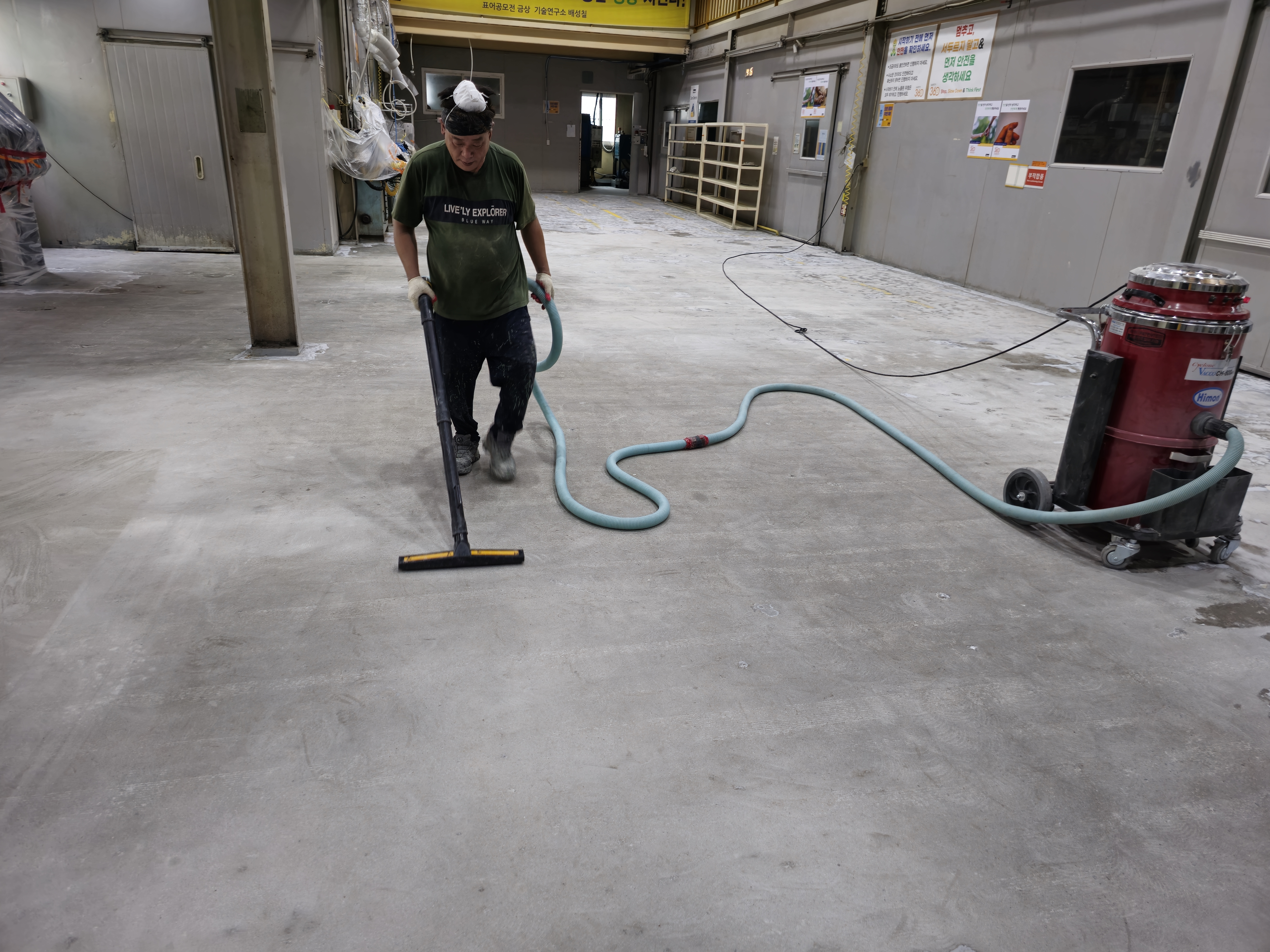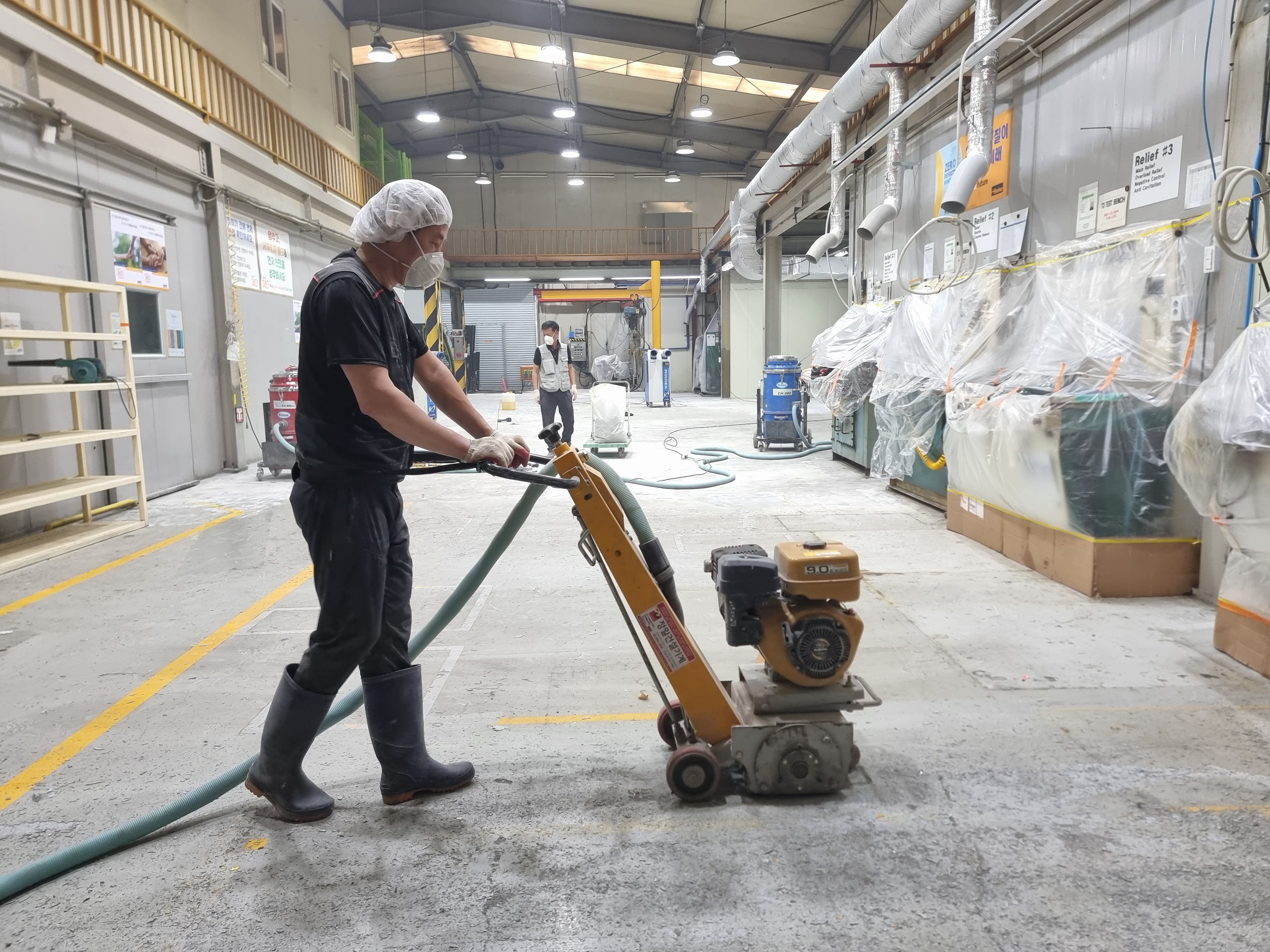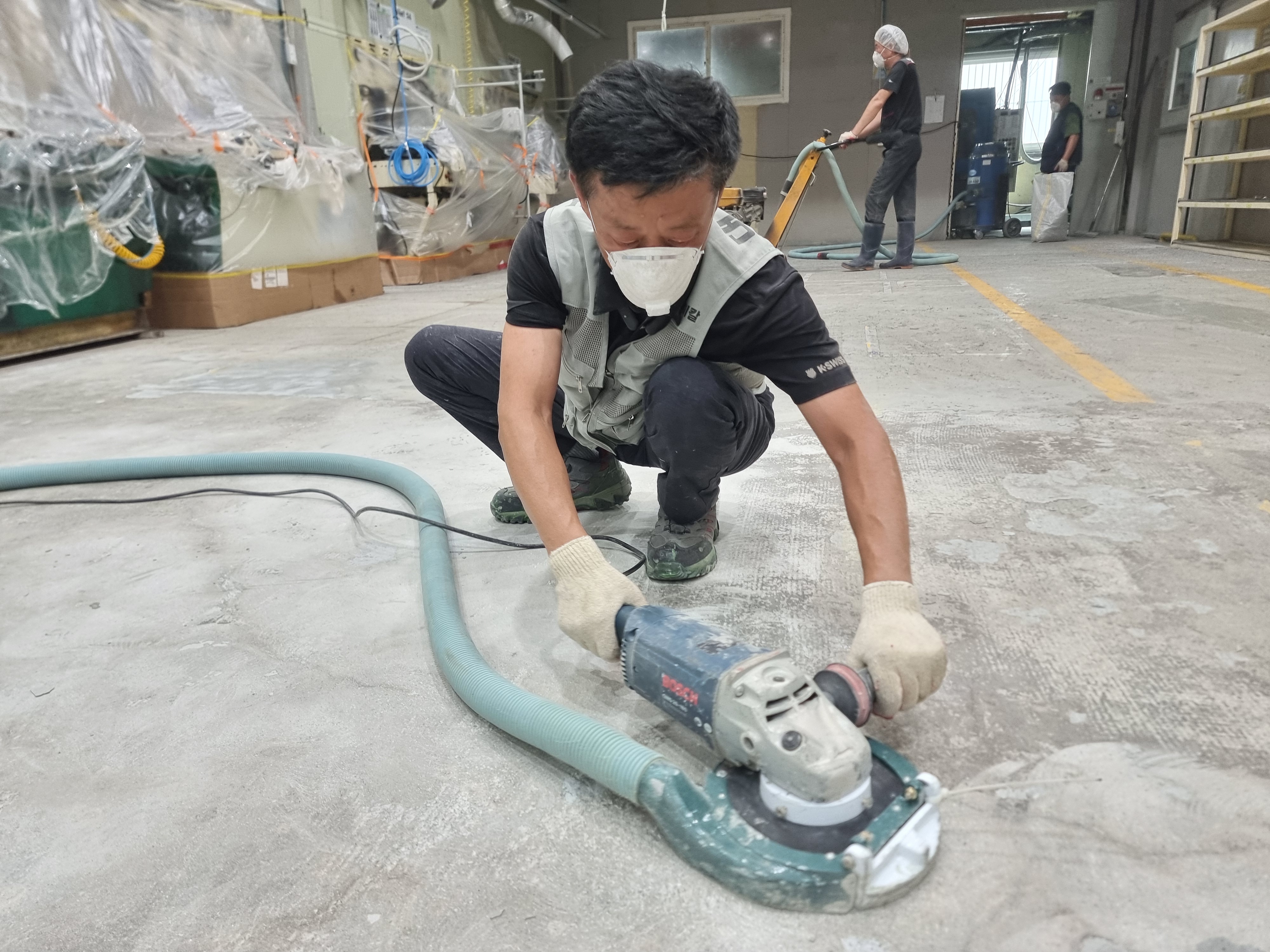 기존의 에폭시 바닥제가 시공된 곳엔 들뜨거나 박리된 도막층은 평삭기나 연삭기를 이용하여 제거 해야하며 내구성이 좋은 튼튼한 바닥재를 만들기 위하여 꼼꼼한 면처리는 필요가 아닌 필수가 되어야 합니다.
