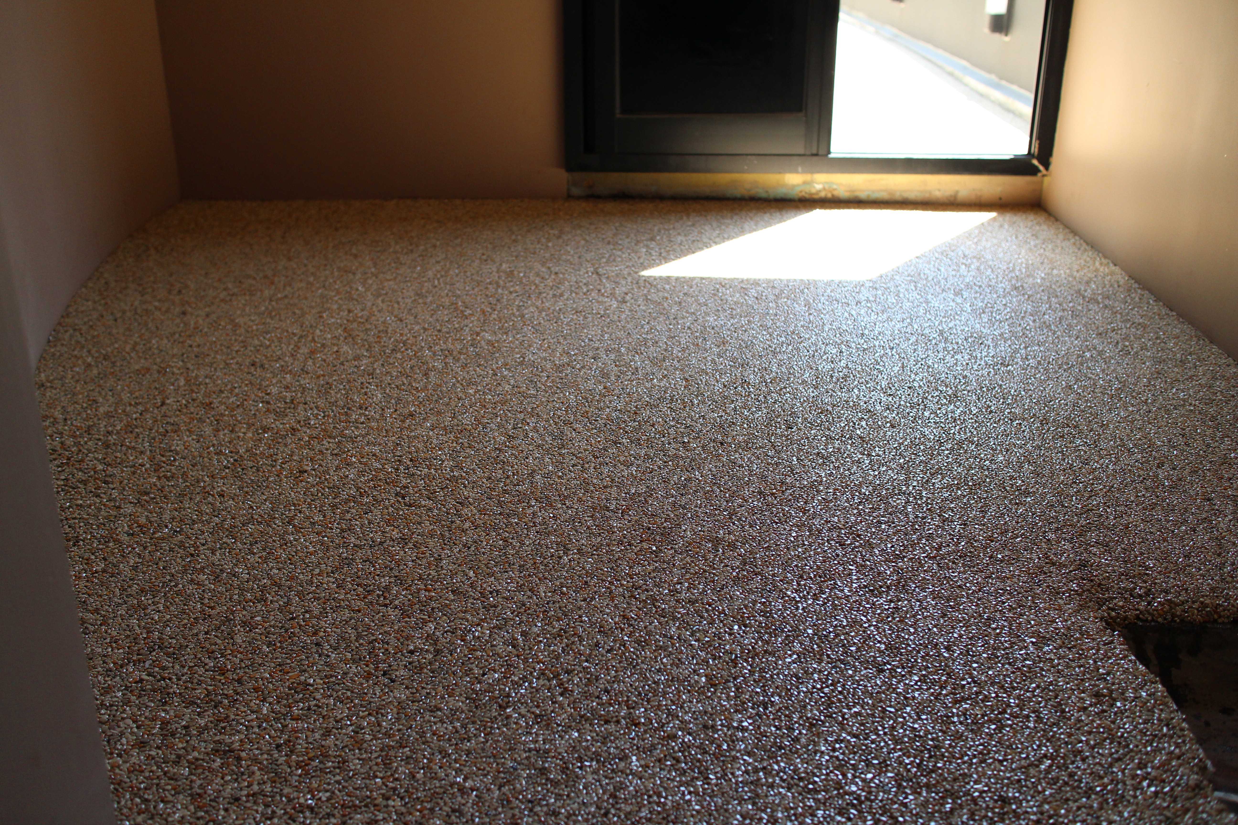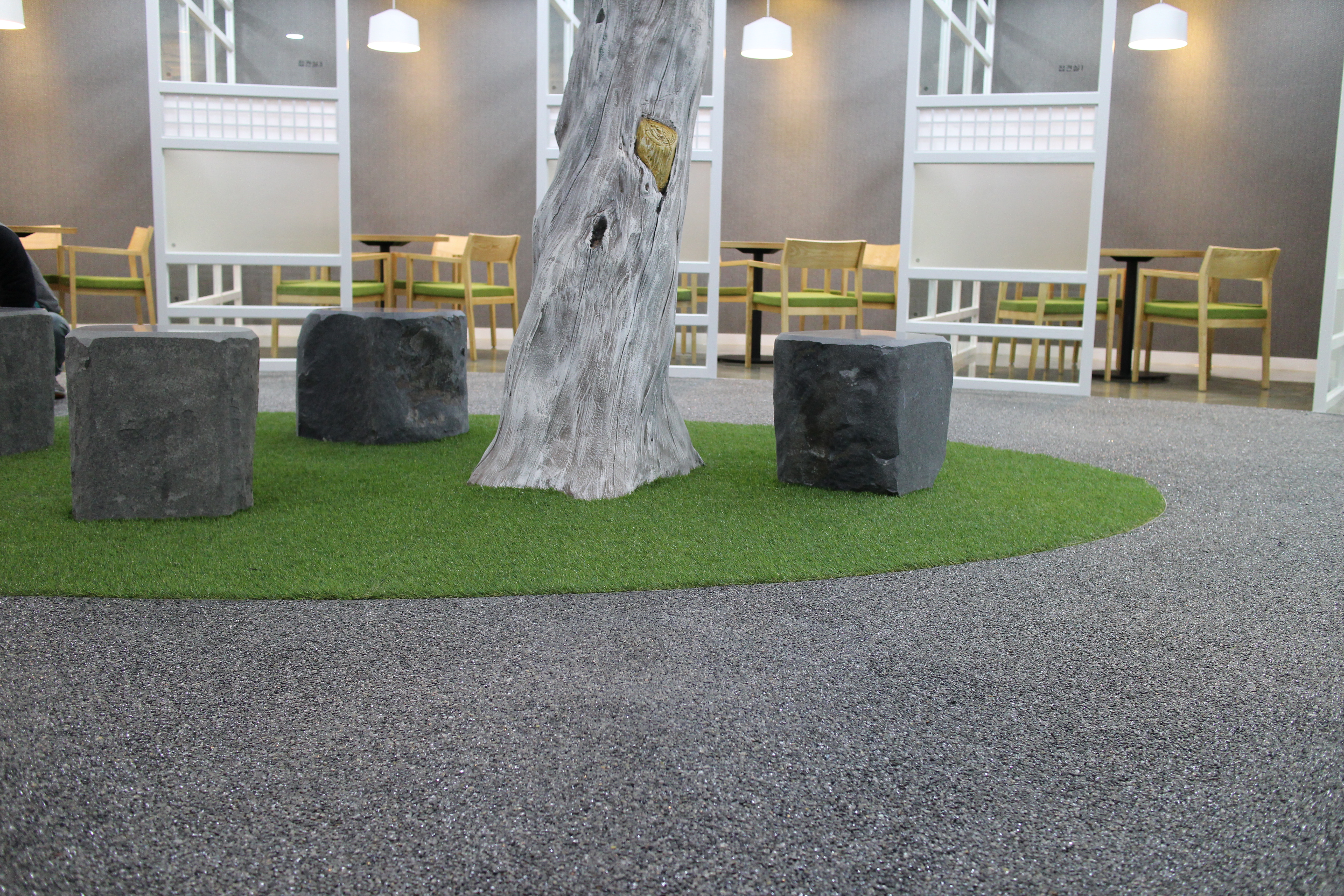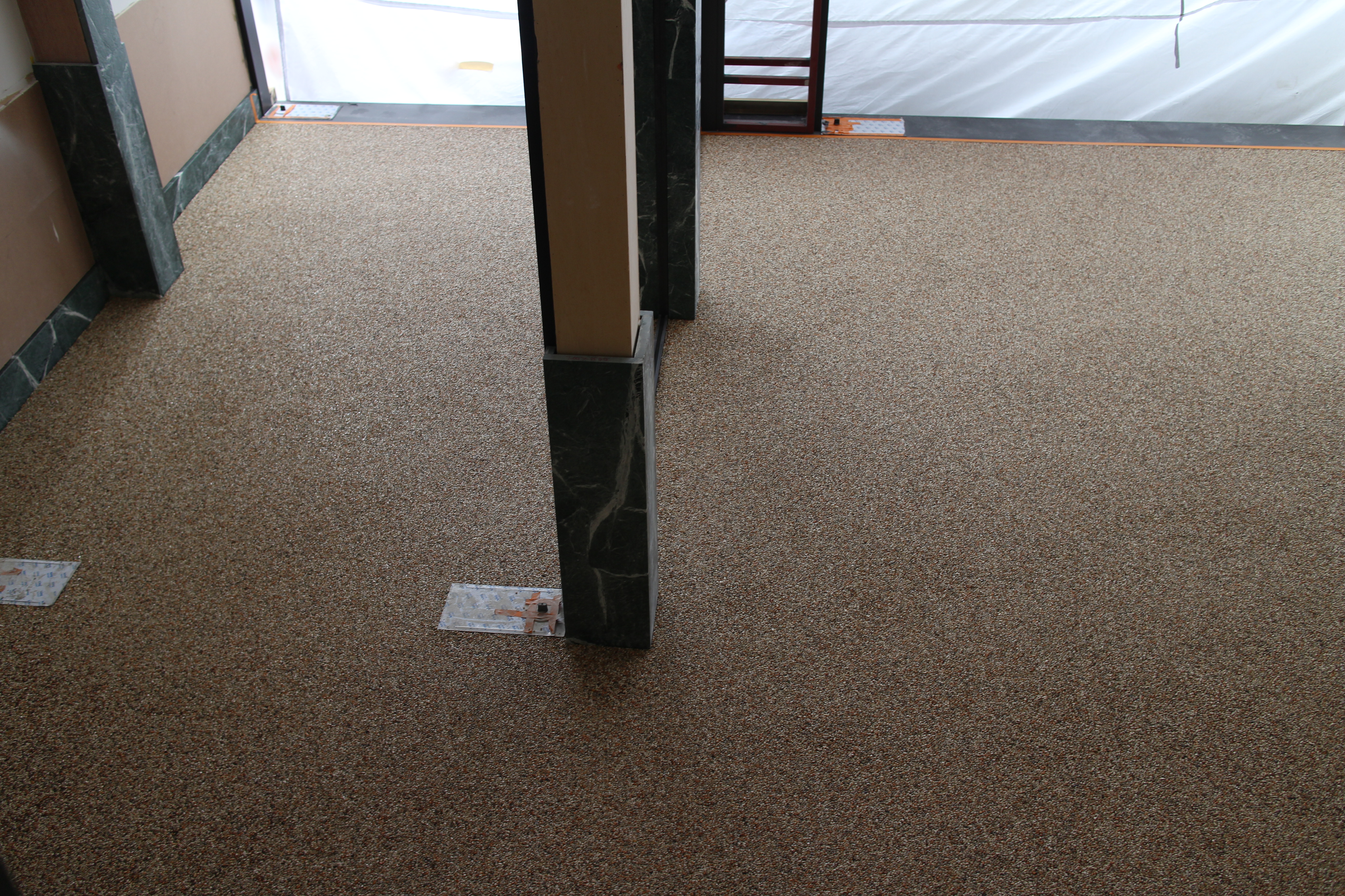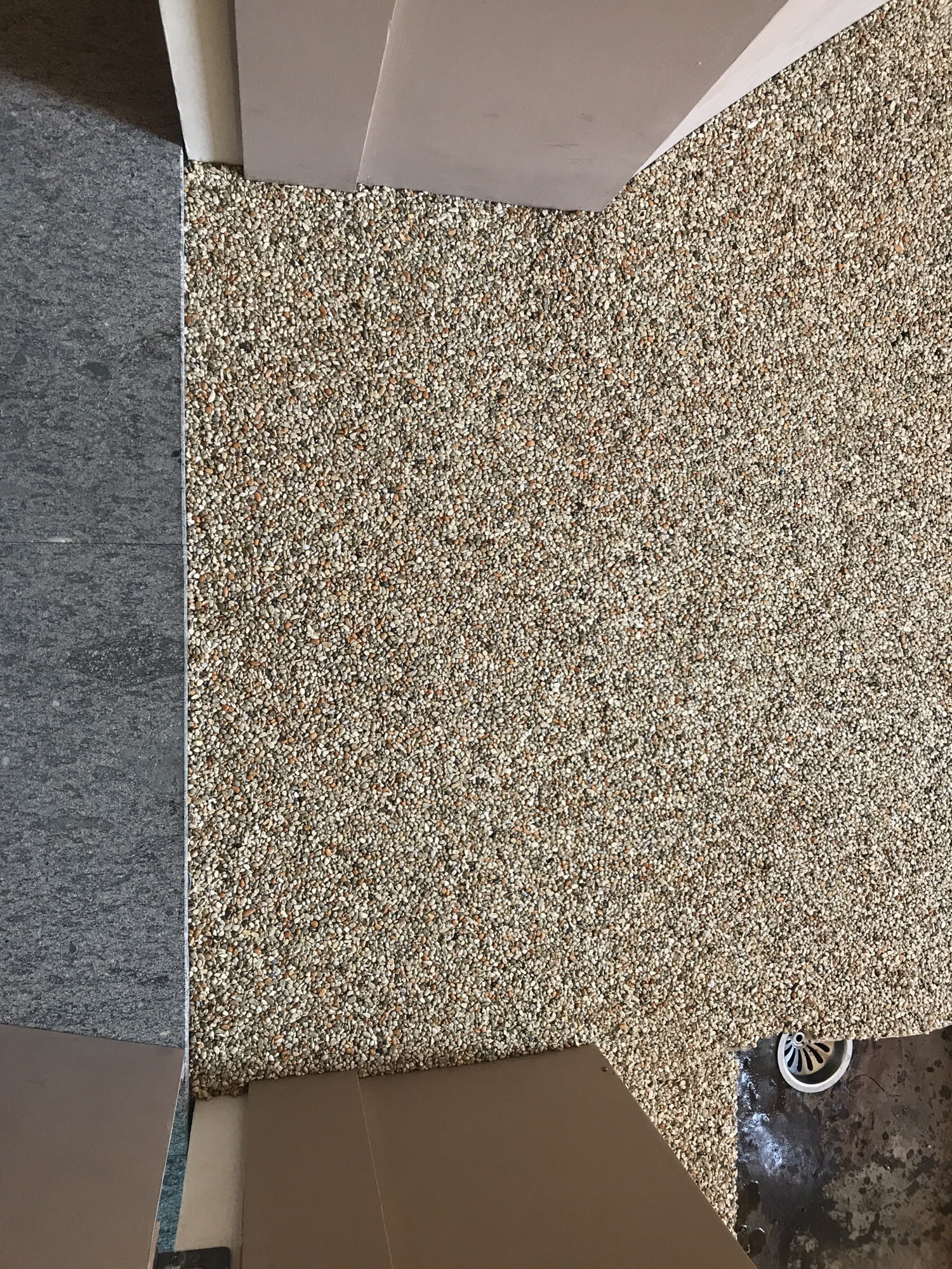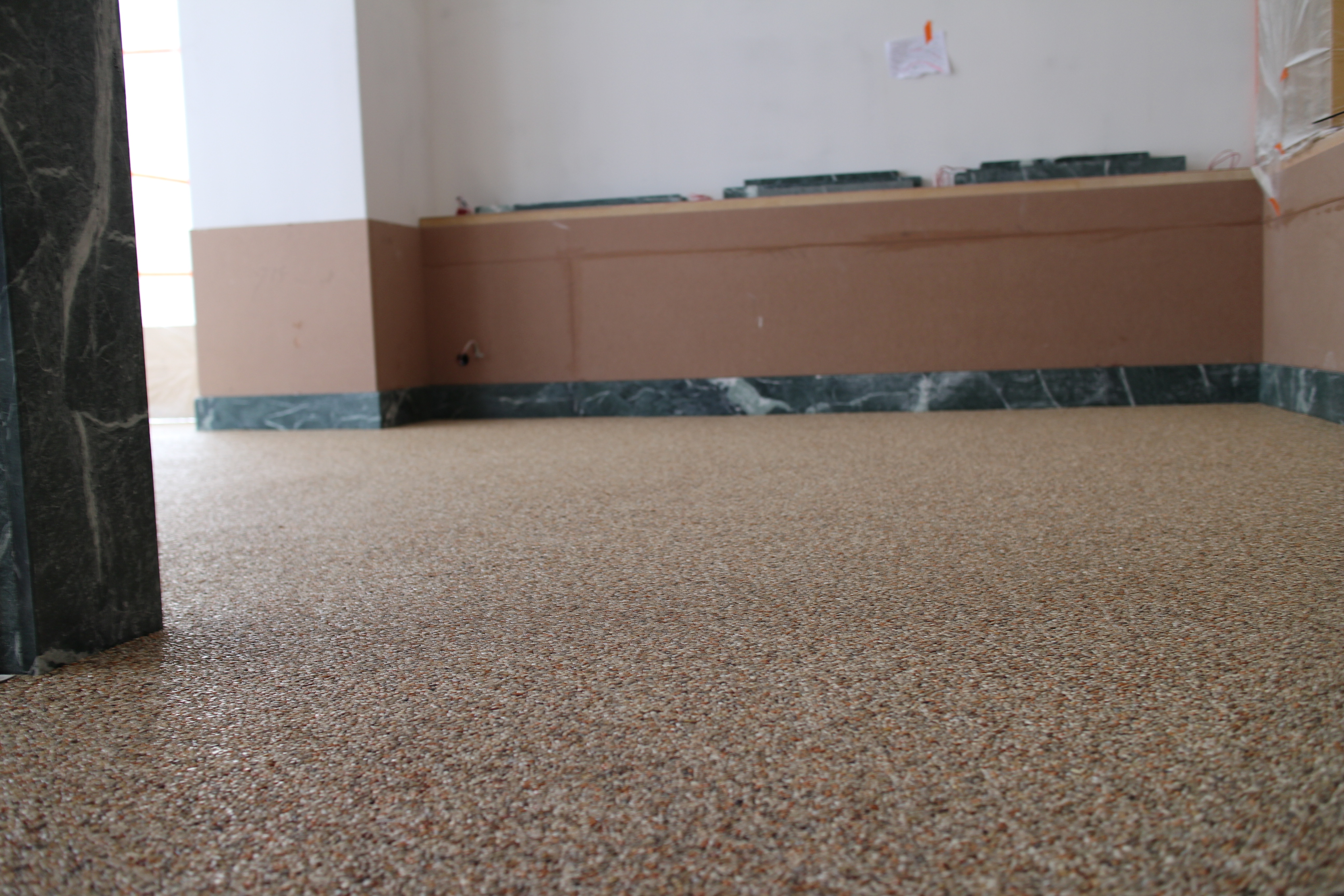 거칠고 노후된 바닥에 원스톱으로 시공되는 콩자갈 수지포장공사, 콘크리트바닥, 타일바닥등에 그라인더 면처리시공후 에폭시투명레진과 자연석 콩자갈을 믹싱하여 바닥에 미장 타입으로 시공합니다.