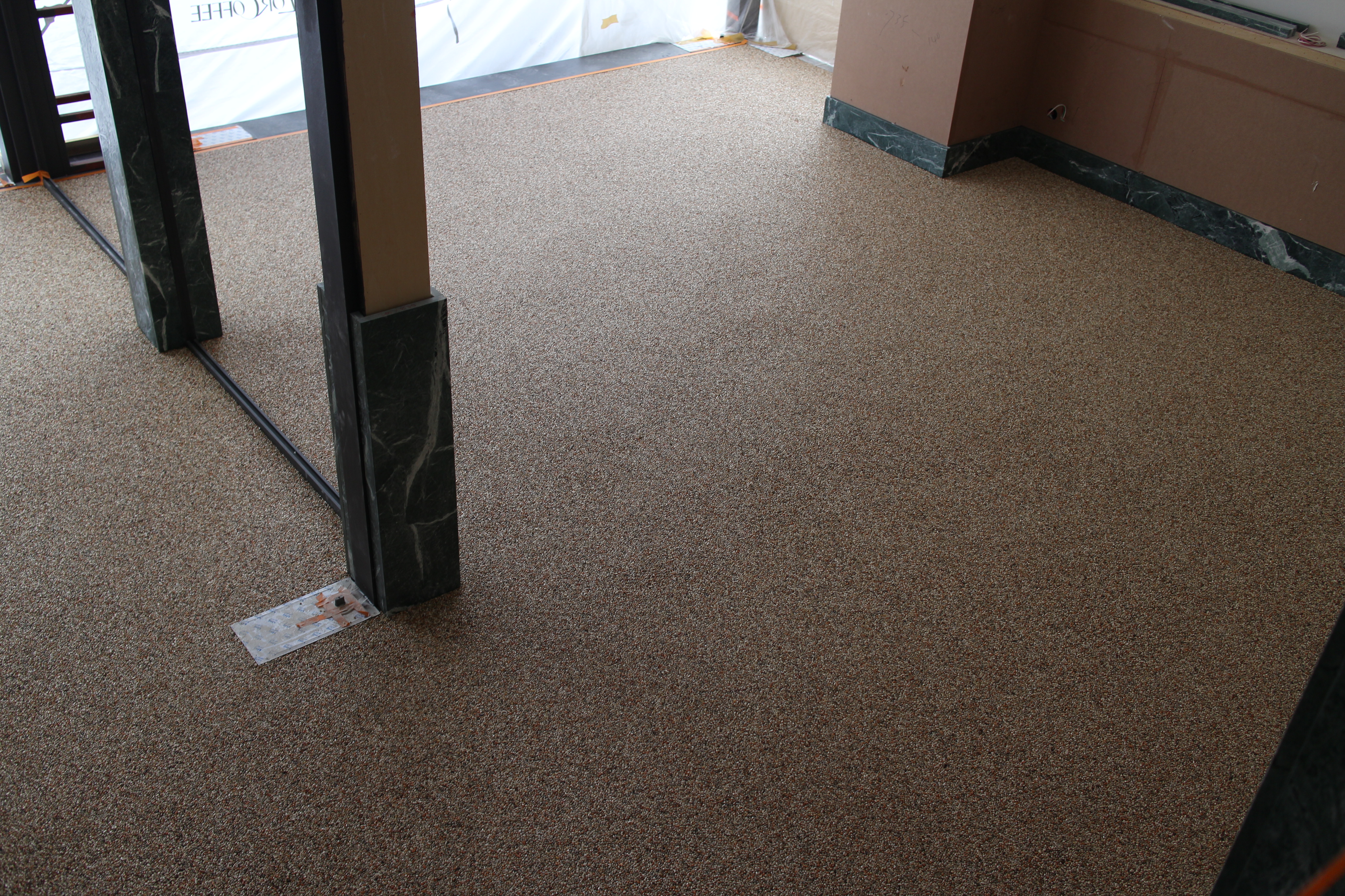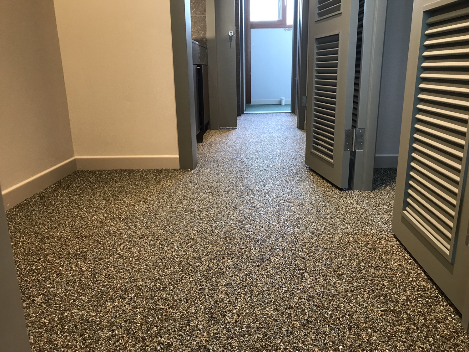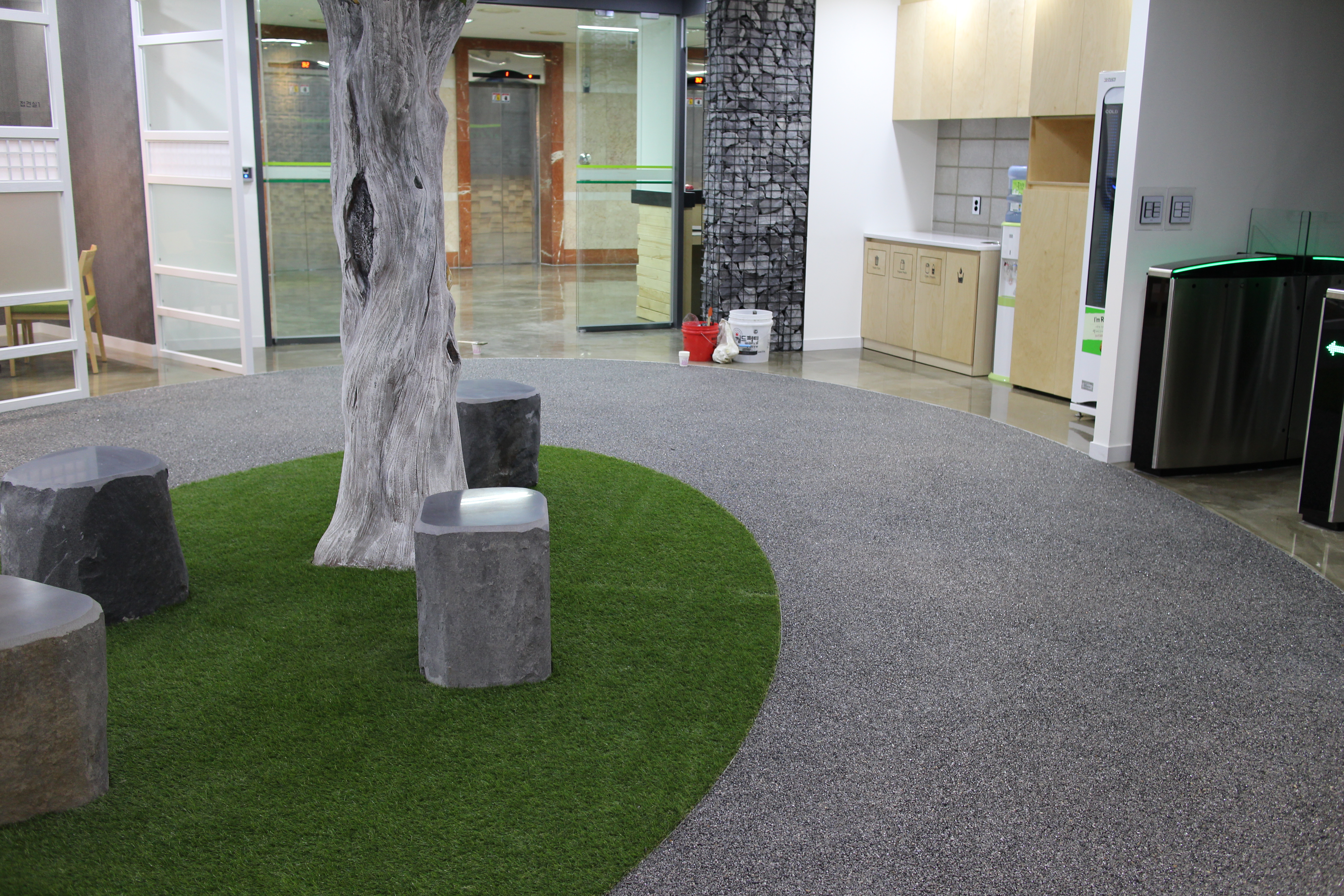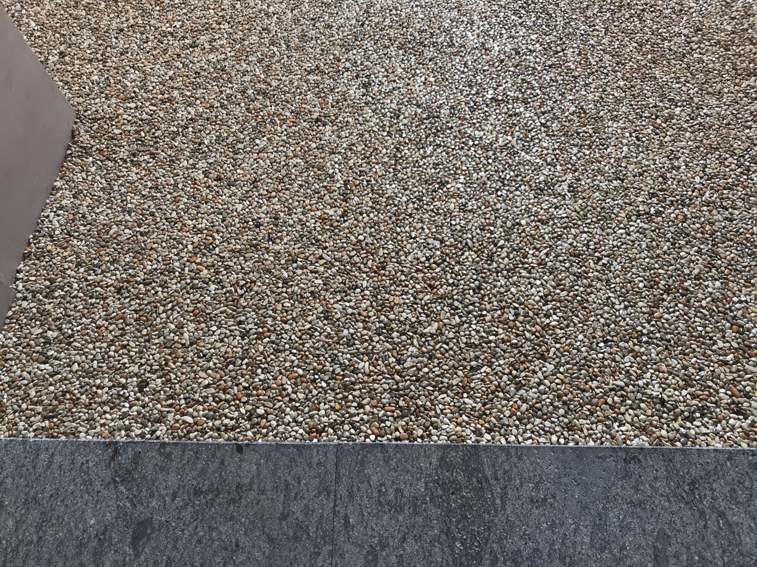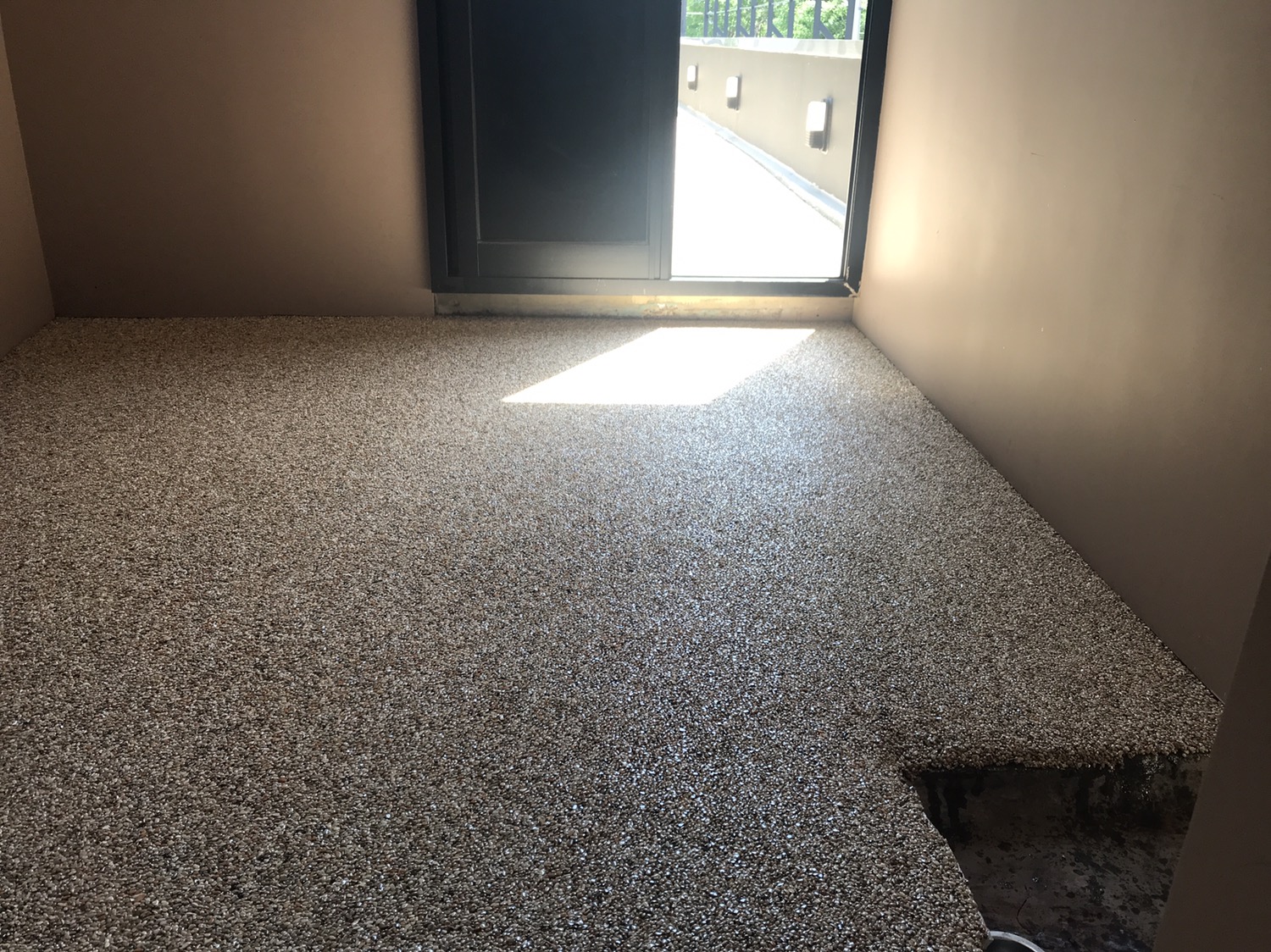 거칠고 노후된 바닥에 원스톱으로 시공되는 콩자갈 수지포장공사, 콘크리트바닥, 타일바닥등에 그라인더 면처리시공후 에폭시투명레진과 자연석 콩자갈을 믹싱하여 바닥에 미장 타입으로 시공합니다.