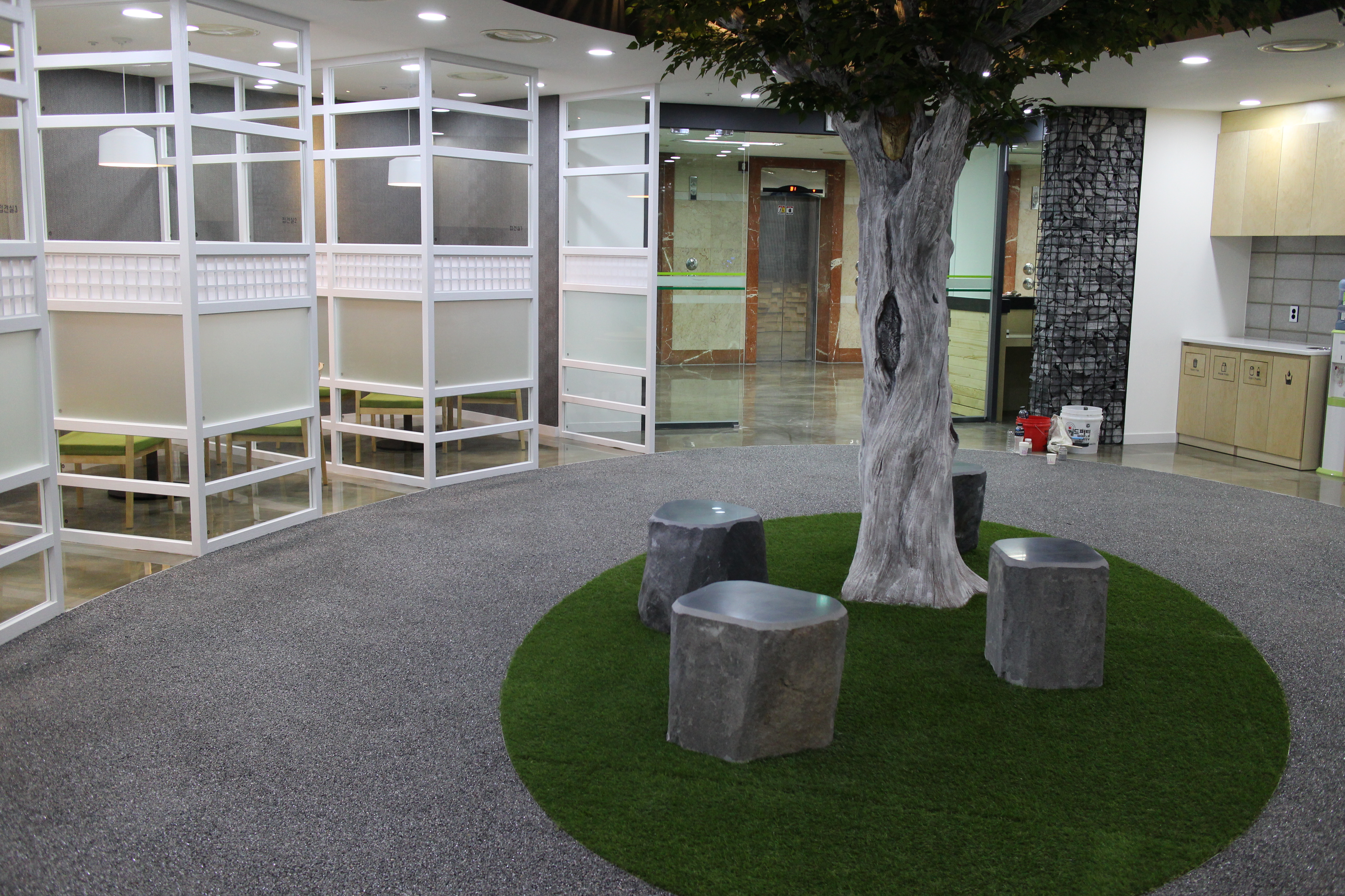 상담실 바닥엔 빈티지 바닥재를 적용하여 시공하여 콩자갈이 더욱 돋보입니다.