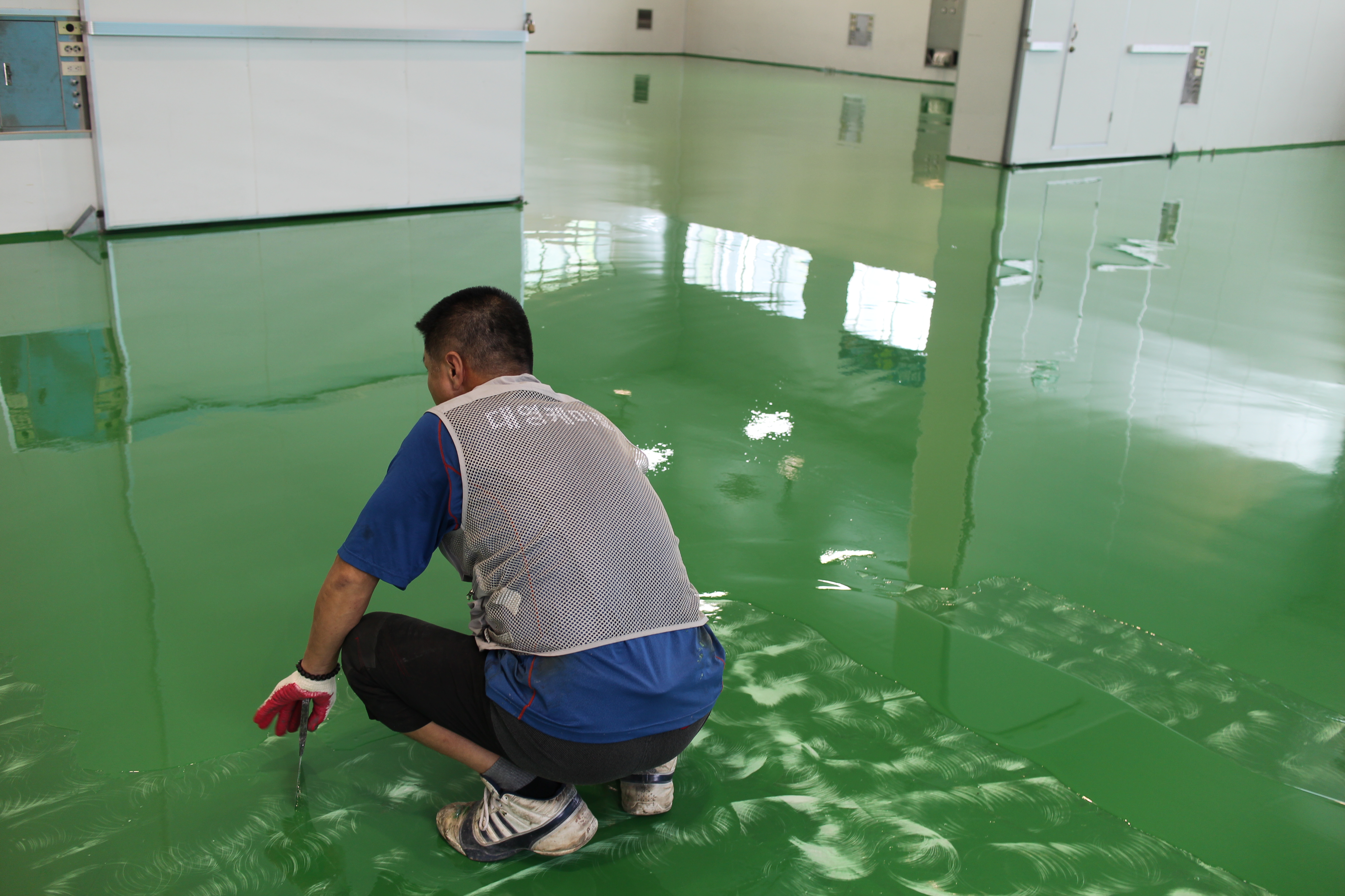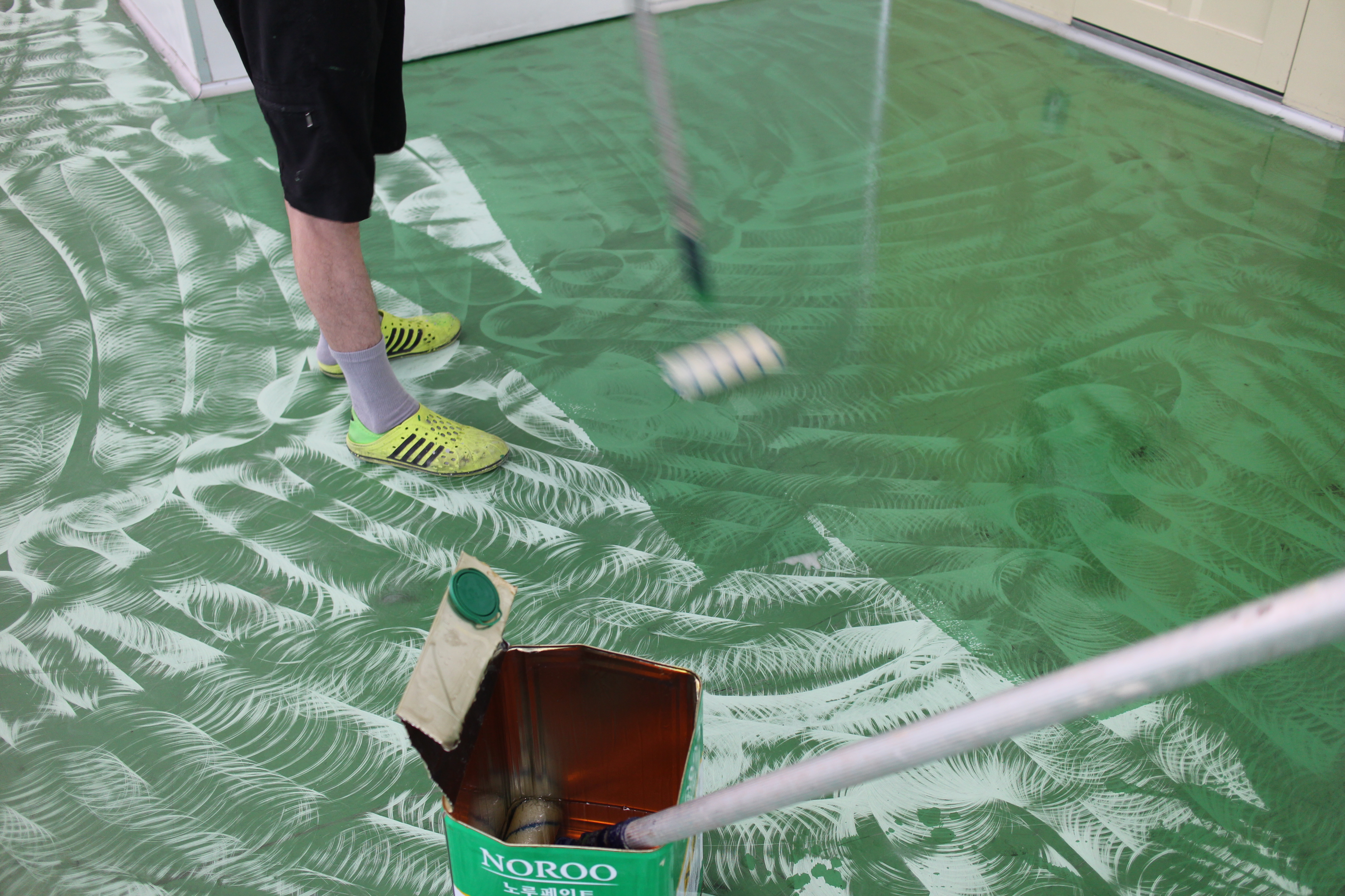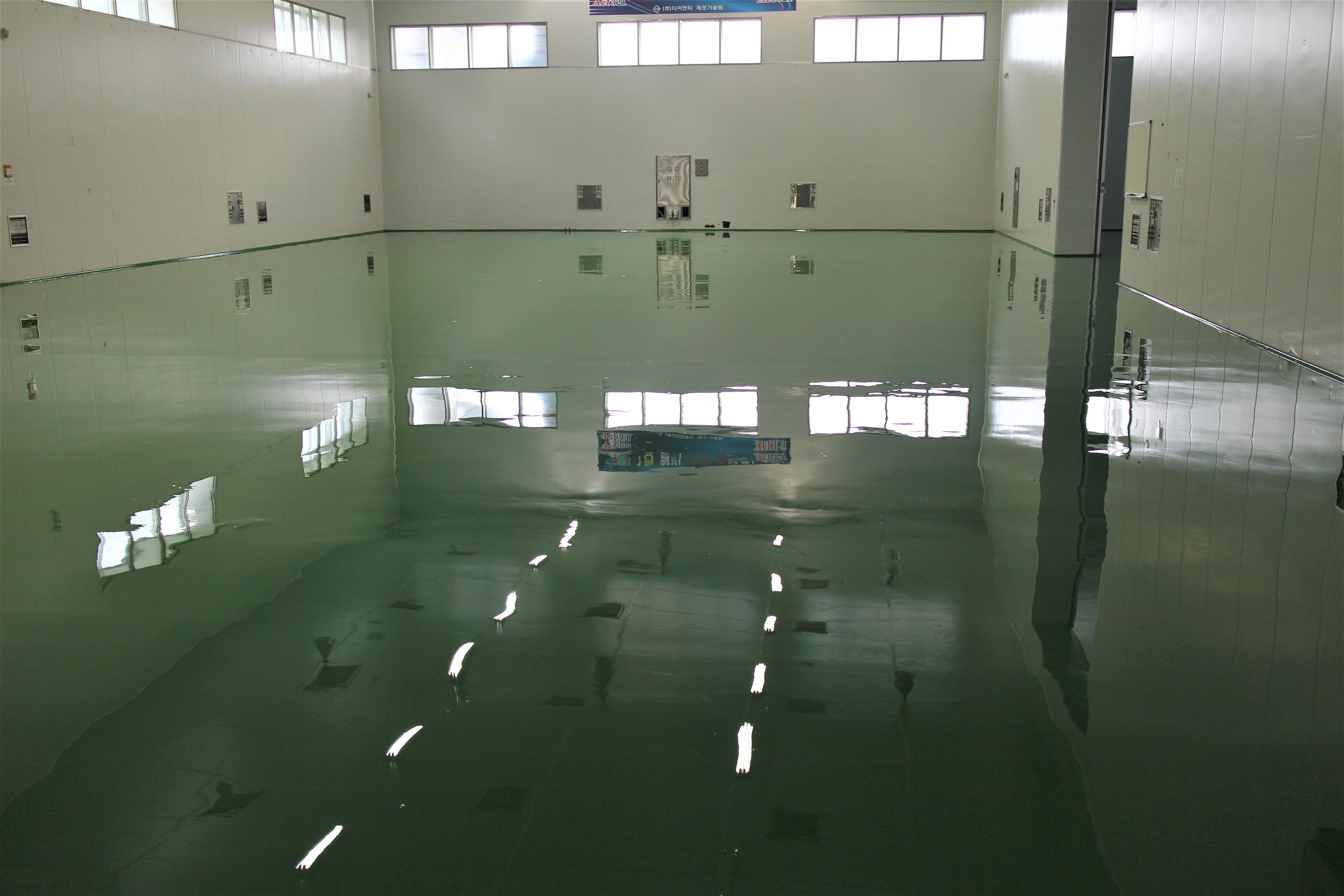2차 에폭시 라이닝 시공 화면입니다 바닥에 중도면처리 한게 보입니다, 마감시공 전 거친 요나 크랙이 발생한다면 에폭시 퍼티를 시공 후 마감공사를 진행합니다. 에폭시 라이닝 마감 시공 후 점검시 크랙이 보이거나 거친 요가 보이거나, 칼자국이나, 빠데 자국이 보이면 안 됩니다.아무것도 보이지 않는 깨끗한 바닥을 만들어야 준공검사시 합격을 받을 수 있습니다.