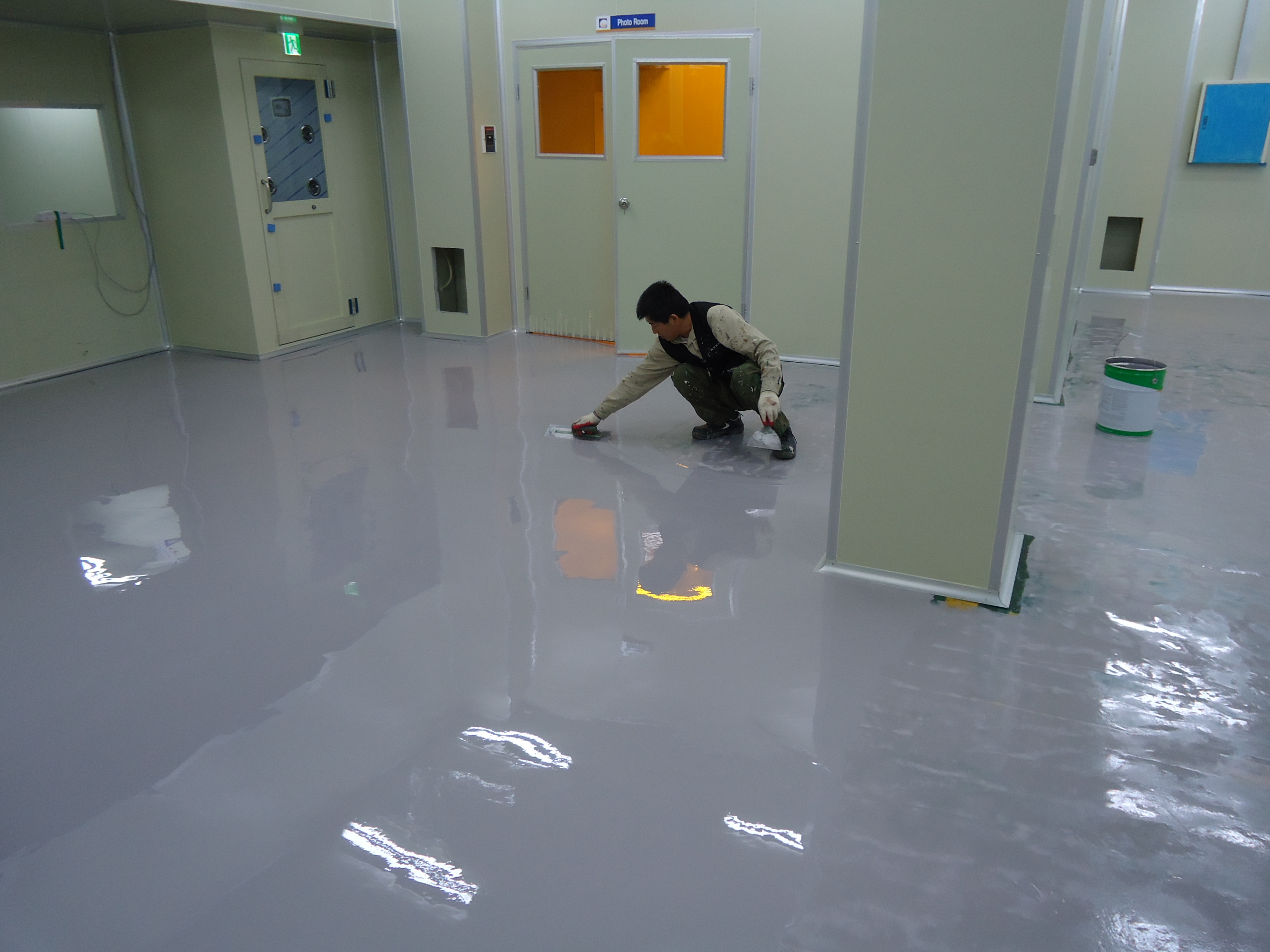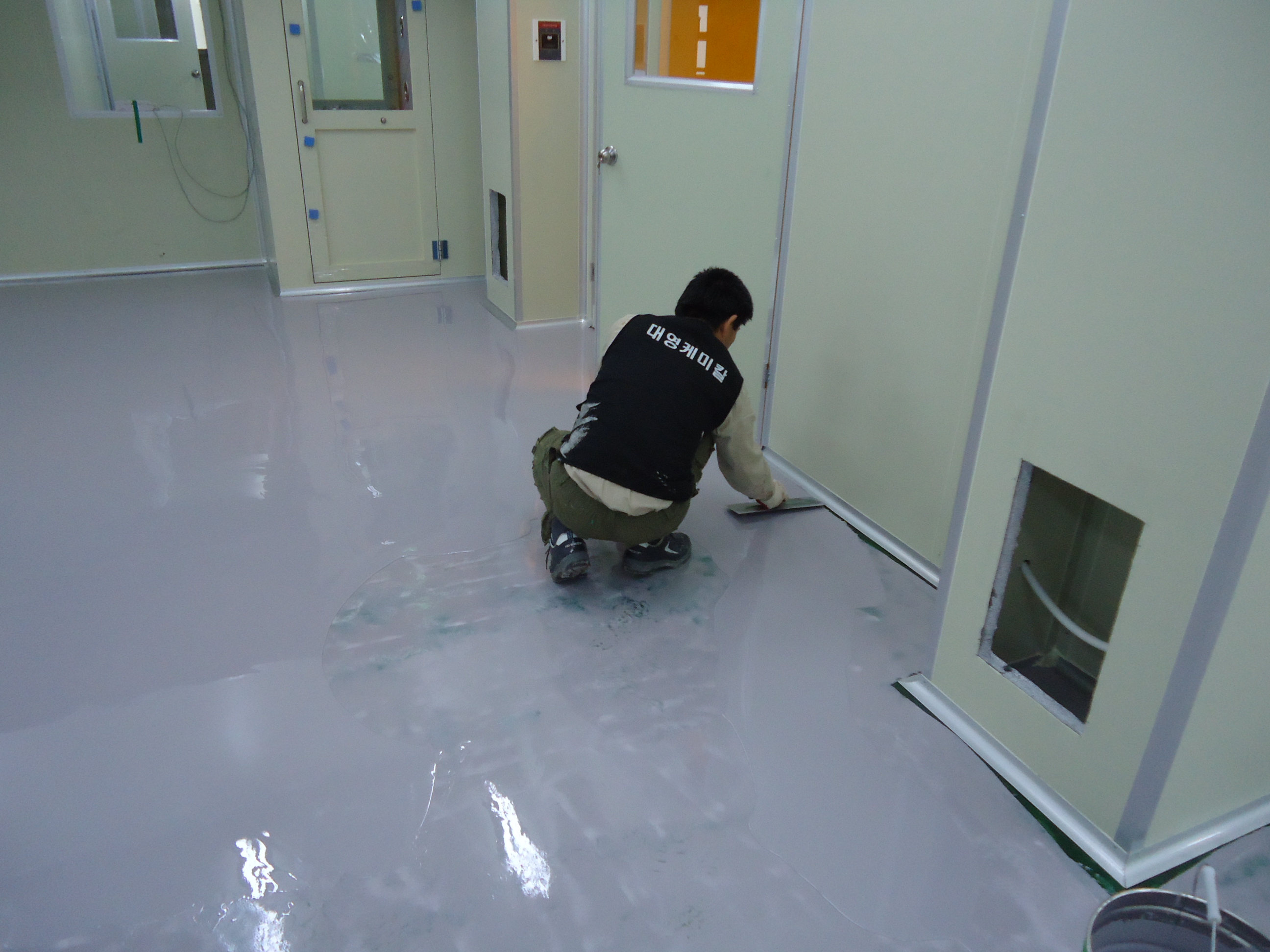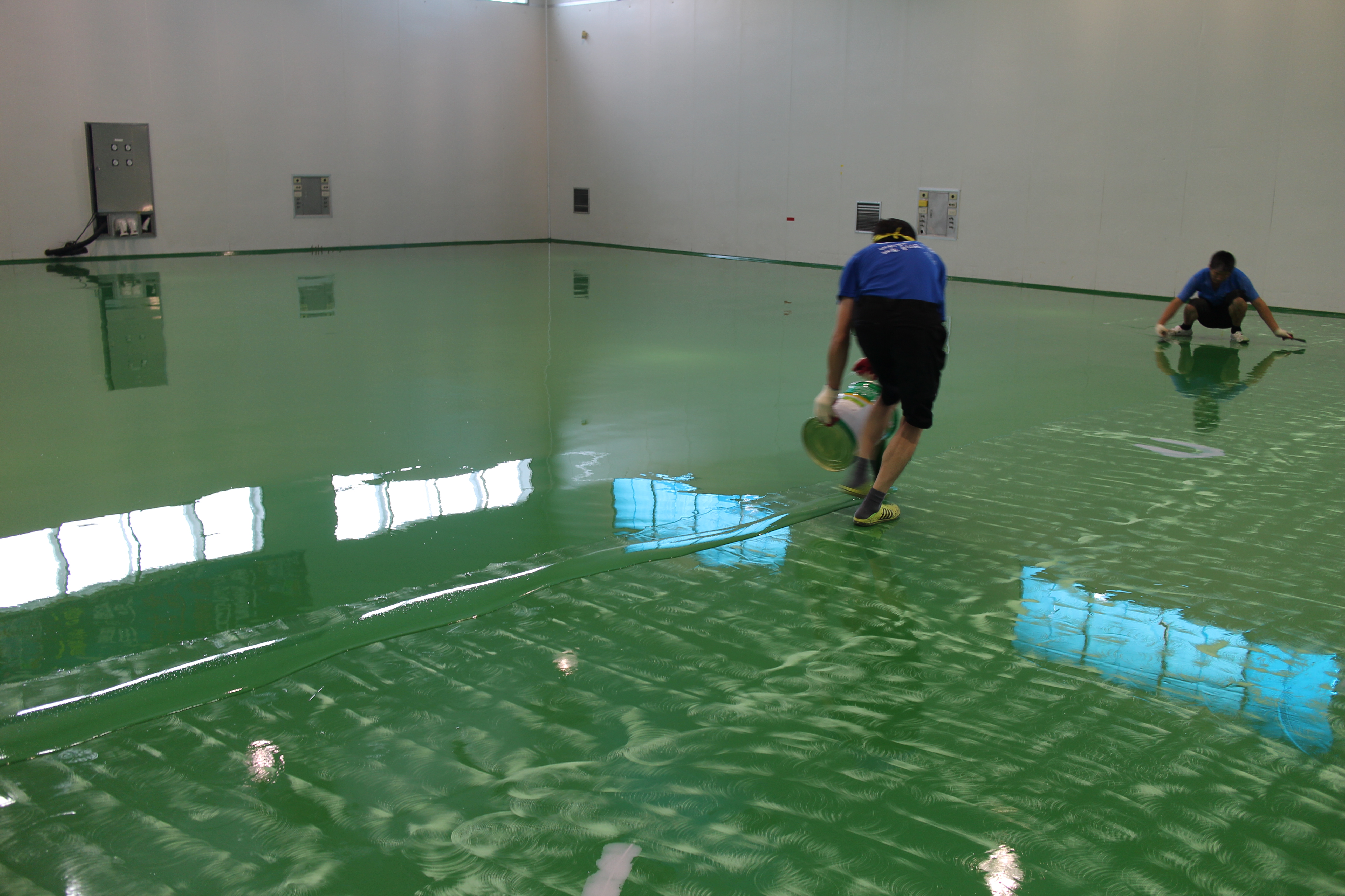 2차 에폭시 라이닝 시공 화면입니다 바닥에 중도면처리 한게 보입니다, 마감시공 전 거친 요나 크랙이 발생한다면 에폭시 퍼티를 시공 후 마감공사를 진행합니다. 에폭시 라이닝 마감 시공 후 점검시 크랙이 보이거나 거친 요가 보이거나, 칼자국이나, 빠데 자국이 보이면 안 됩니다.아무것도 보이지 않는 깨끗한 바닥을 만들어야 준공검사시 합격을 받을 수 있습니다.